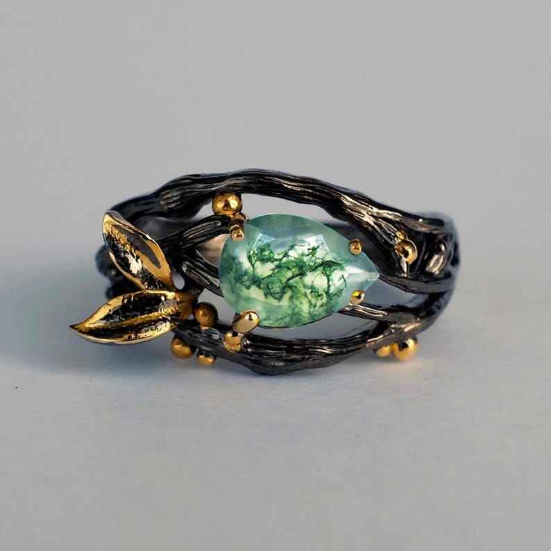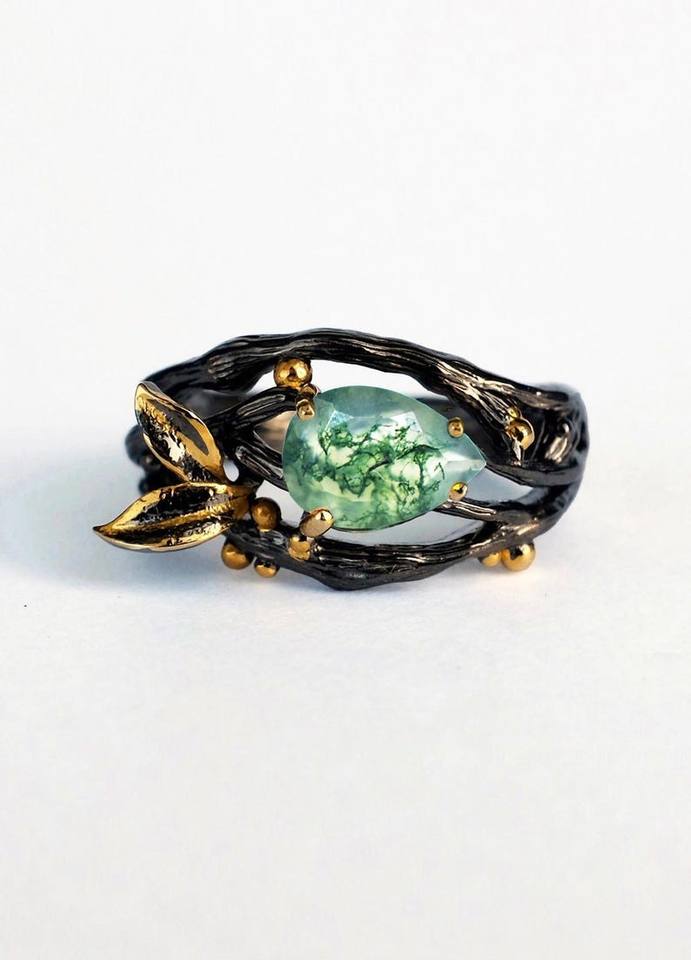 Anillo de Ágata Musgosa con Tres Ramas, Chapado en Rodio, Plata de Ley, Elegante para Bodas y Uso Diario, Inspirado en la Naturaleza, Artesanía de Lujo