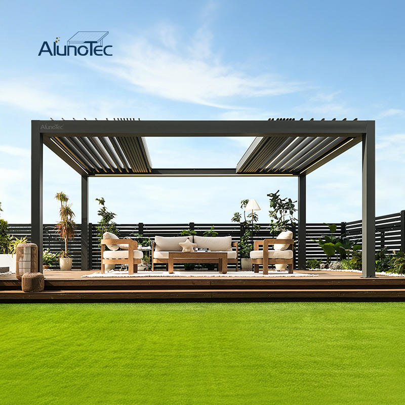 Sistema de pérgola más avanzado AlunoTec, techo de lamas giratorias y retráctiles motorizado, invernadero de lujo impermeable y porche acristalado moderno