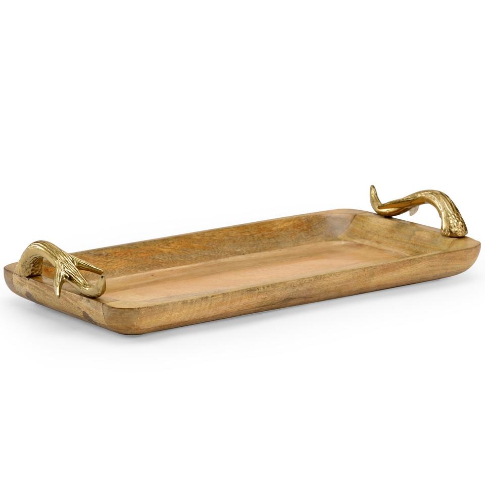 La bandeja de madera de forma rectangular de alta calidad de lujo más increíble con asas acabadas en plata metálica