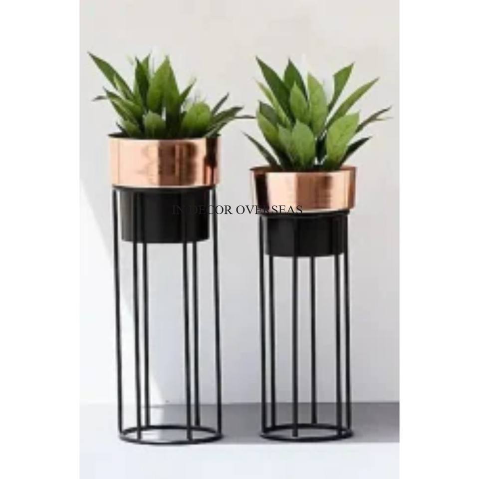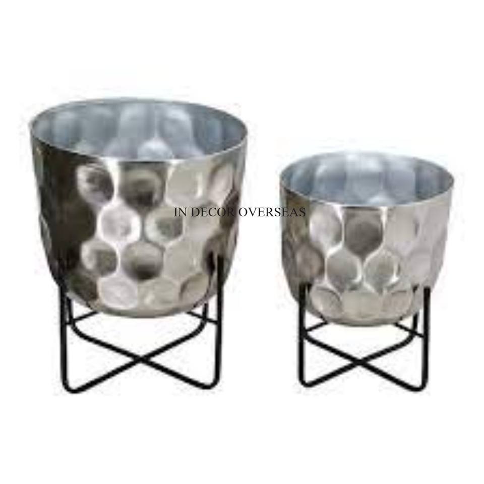 Maceta de Metal de forma redonda con textura martillada grande pulida brillante con acabado plateado de diseñador único de lujo con soporte negro