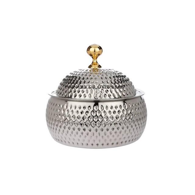 Cazuela de forma redonda de Metal resistente pulido brillante plateado de diseñador único más elegante para servir comida con mango chapado en oro