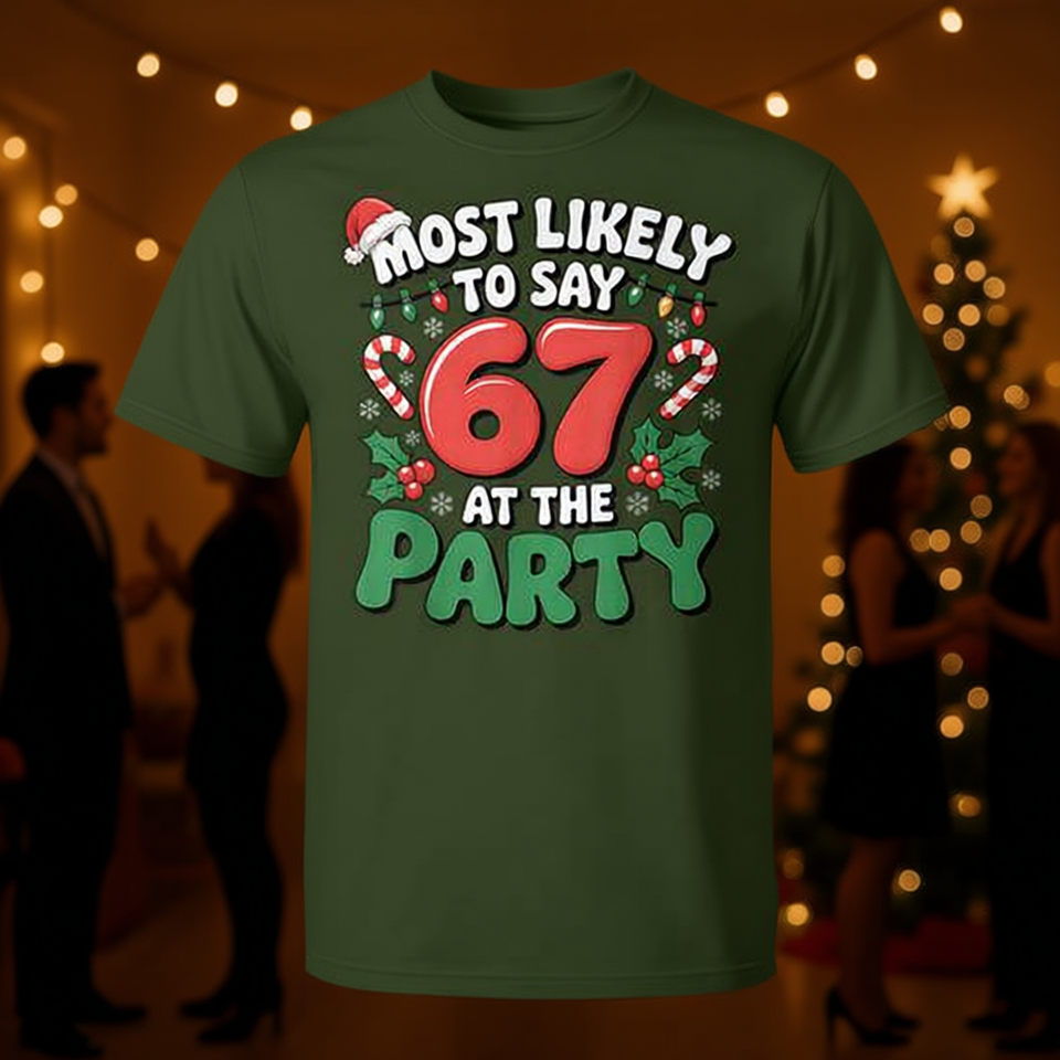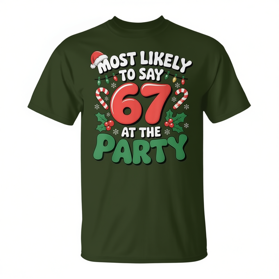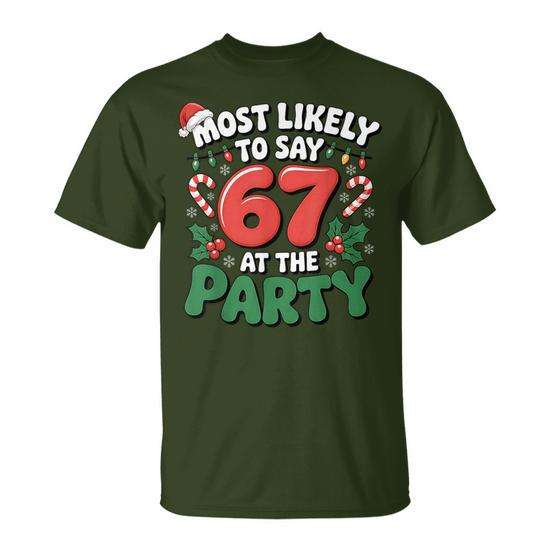 Camiseta navideña con la frase "Most Likely To Say 67 At The Party" en verde, talla XL