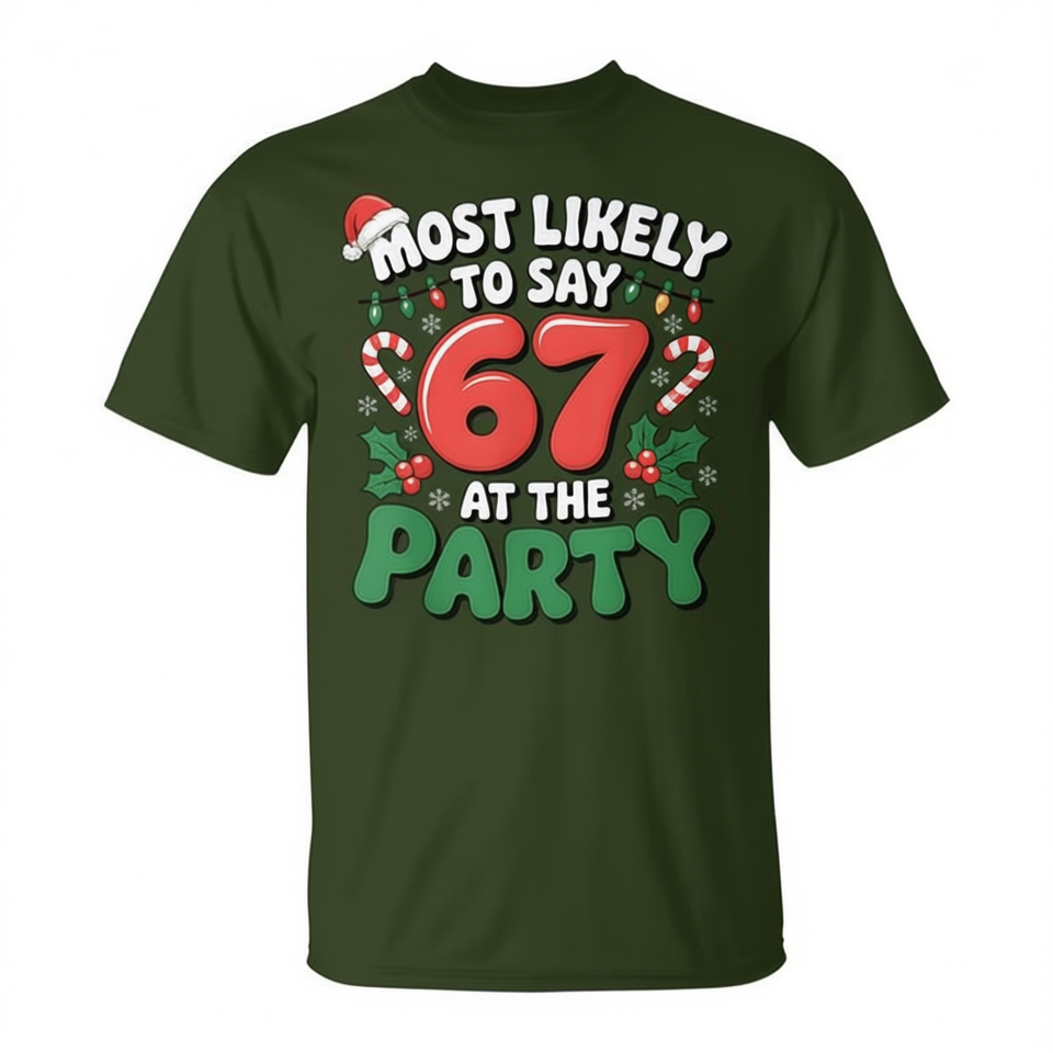 Camiseta navideña con la frase "Most Likely To Say 67 At The Party" en verde, talla para adulto