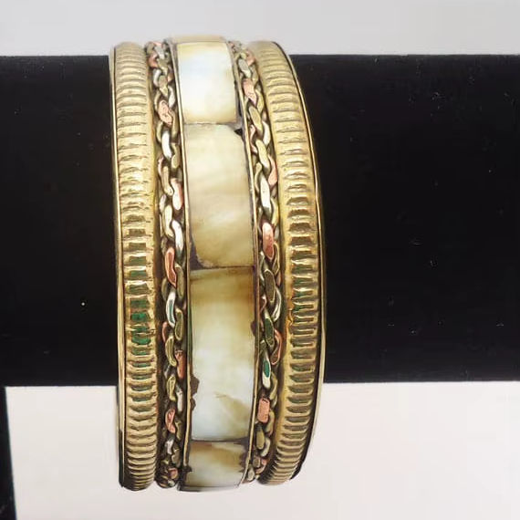 Conjunto de Brazaletes de Latón con Incrustaciones de Nácar, Corte Corazón, Brazaletes Modernos para Mujer, Brazaletes Redondos Hechos a Mano, Joyería de Moda, Regalo