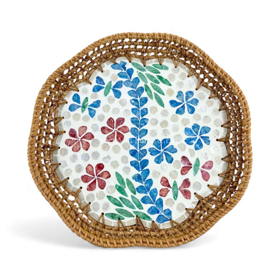 Bandeja de Ratán con Incrustaciones de Nácar y Borde de Ratán Hecho a Mano para Servir Alimentos Decorativos y Uso Doméstico de Vietnam