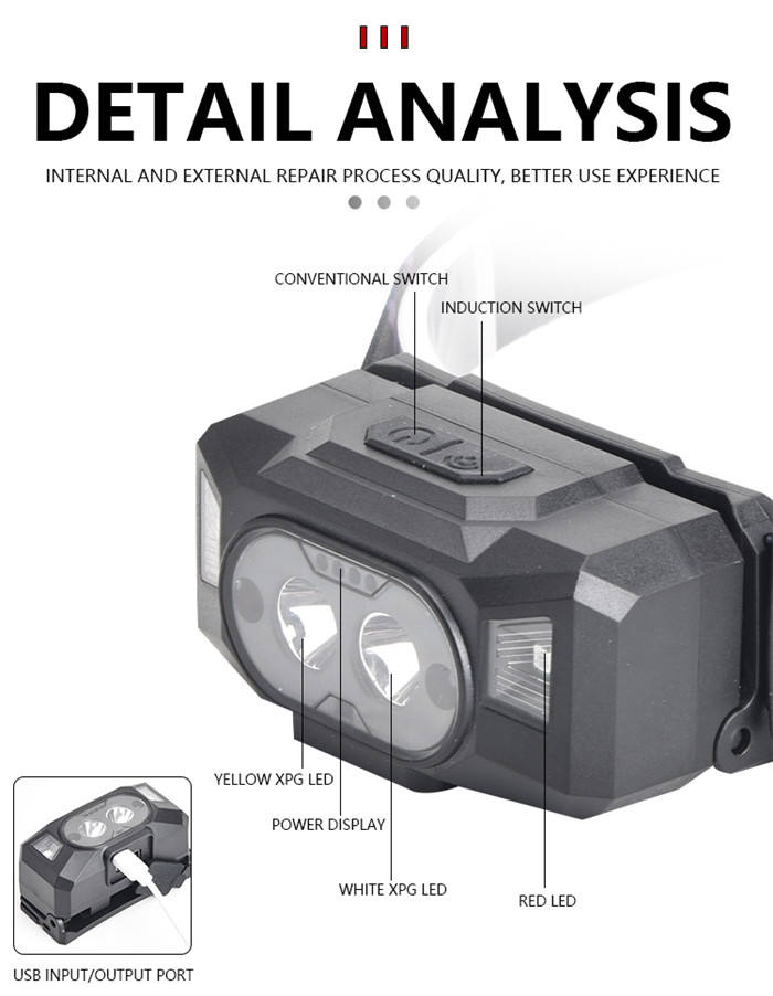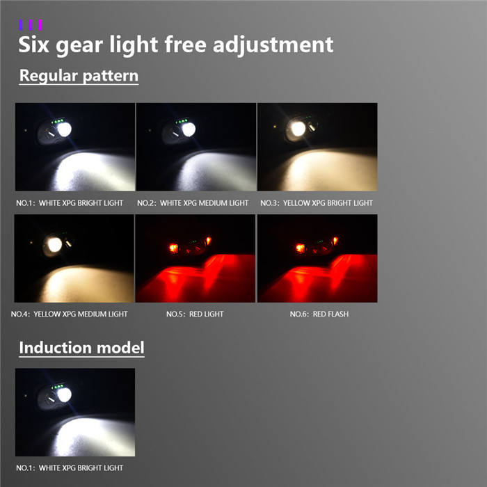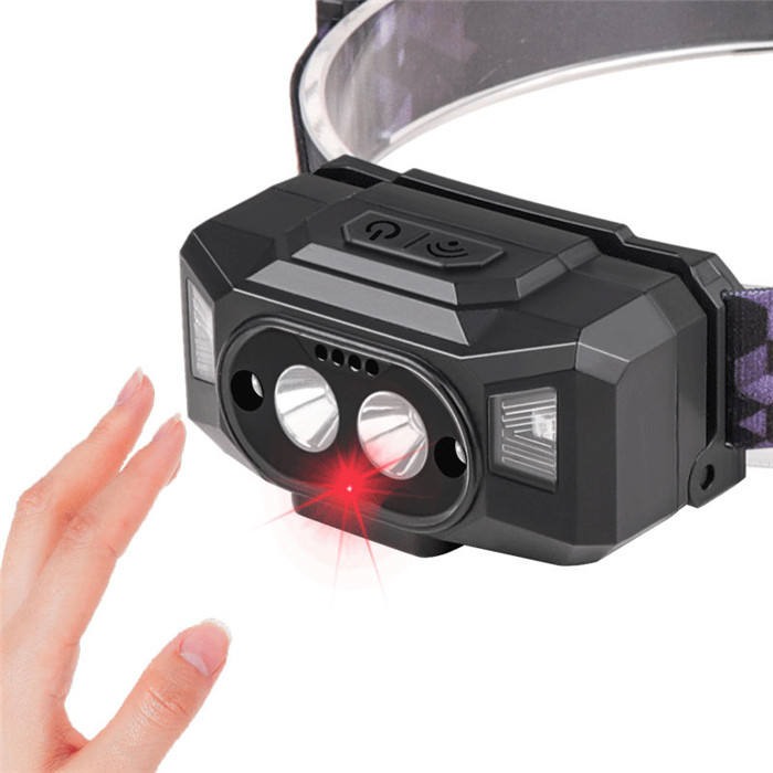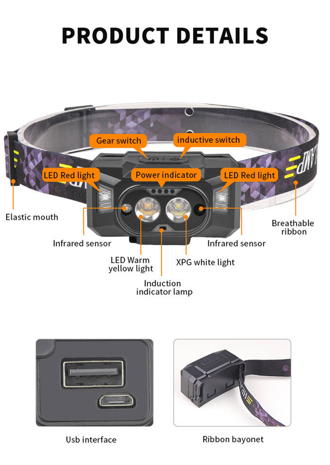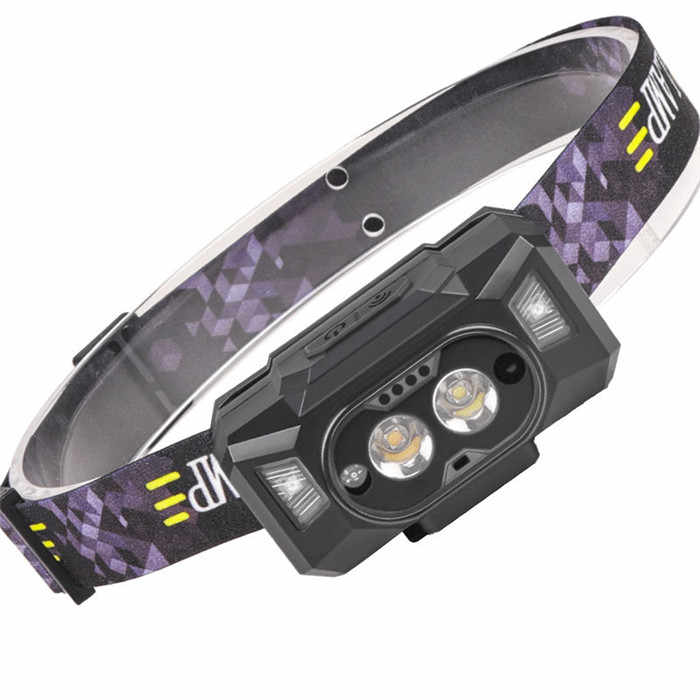 Sensor de movimiento 500LM Mini faro LED rojo + amarillo Faro LED recargable por USB Potente 6 modos Camping LED Head Torch Lamp