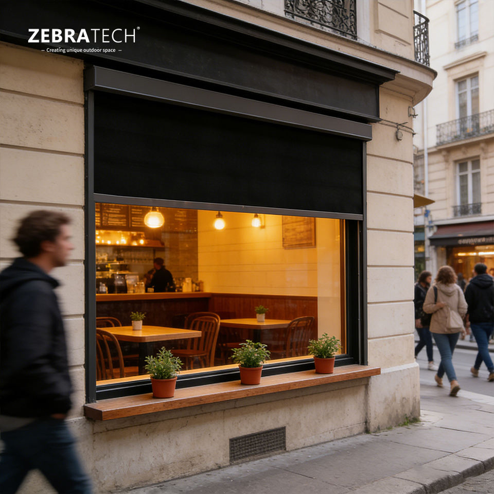 Sistema de Persiana Enrollable Motorizada con Riel, Certificación CE GREEN GUARD, Resistente al Viento, Diseño Moderno para Ventanas Francesas, Paredes de Cristal Exteriores y Patios