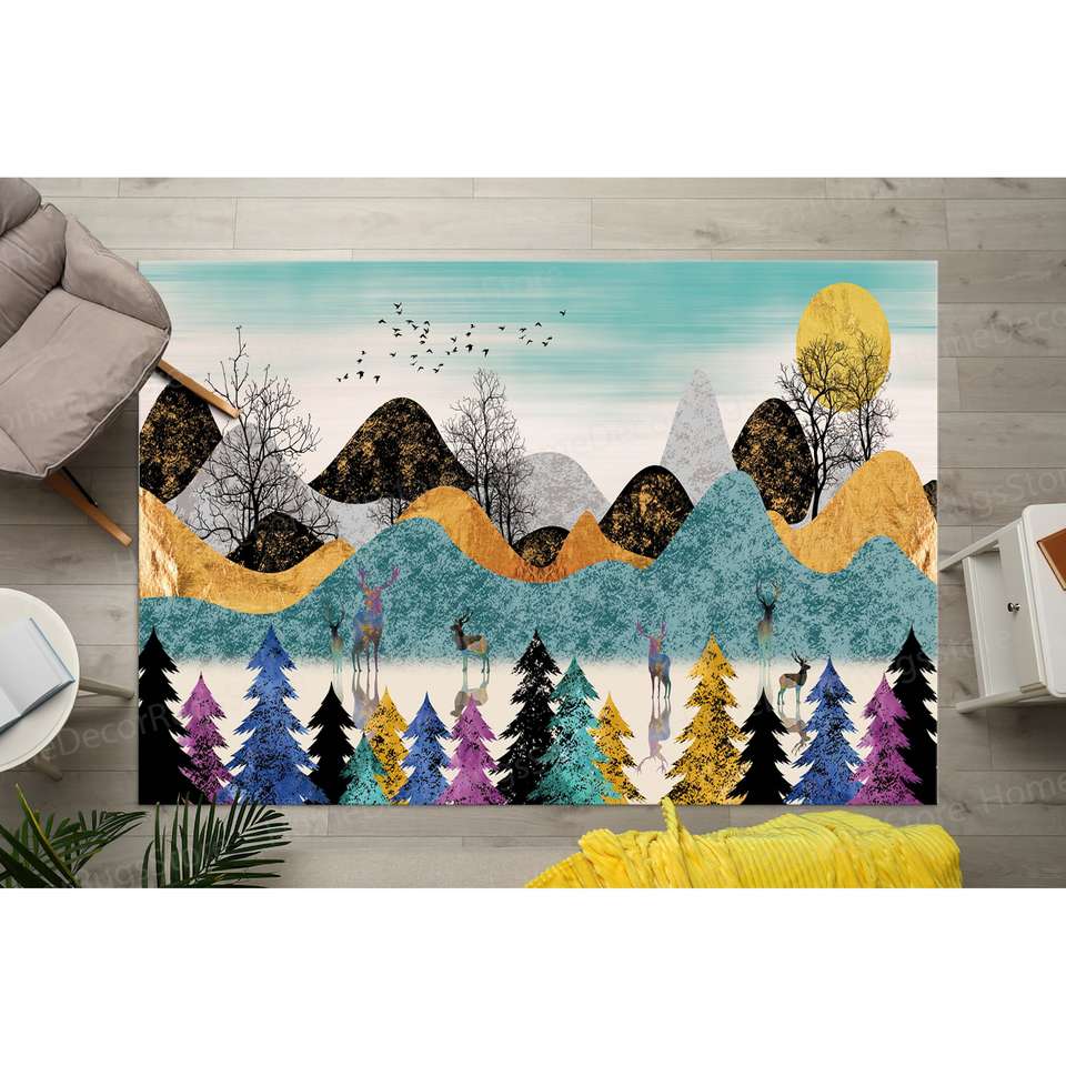Alfombra con Estampado de Paisaje de Montaña, Bosque Abstracto, Exterior, Vista Colorida, Alfombra Delgada No Tejida