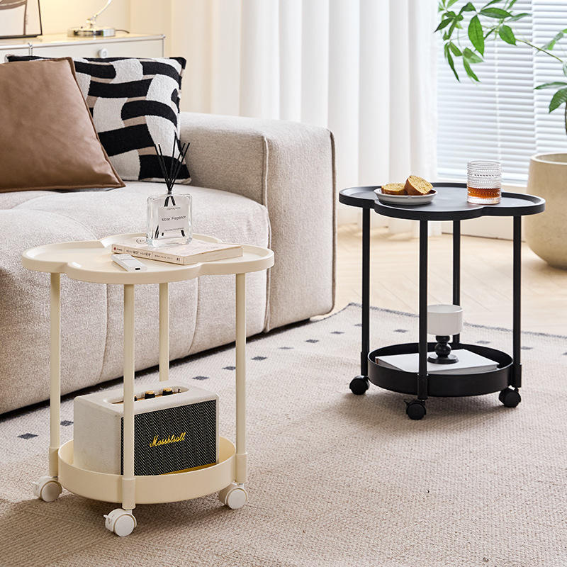 Mesa auxiliar móvil con estante de almacenamiento, 2 compartimentos, gabinete para sala de estar, diseño de trébol de cuatro hojas, carrito rodante para área del sofá