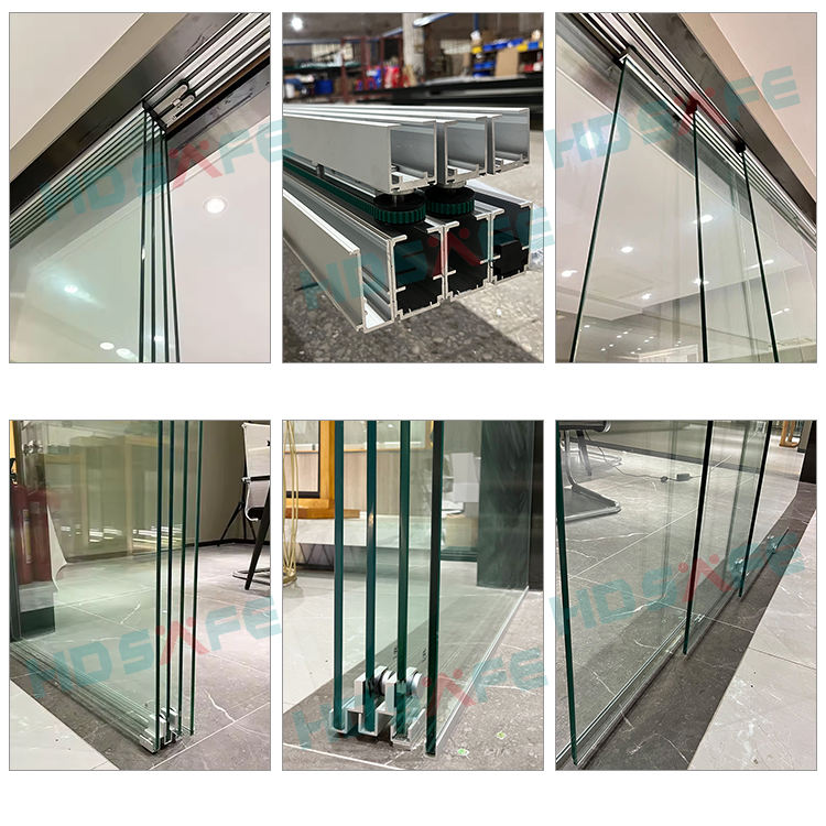 Puerta corredera telescópica de paneles de vidrio móvil para oficina, hotel o salón — sistema interior de puerta de vidrio sin marco