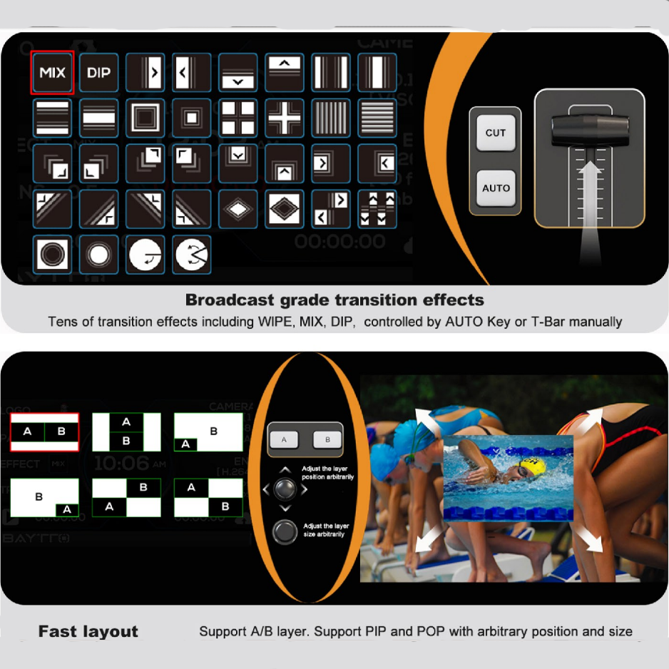 Functions:Transition, Layout,Chrome Key, Layer, Mask,PTZ control, Logo