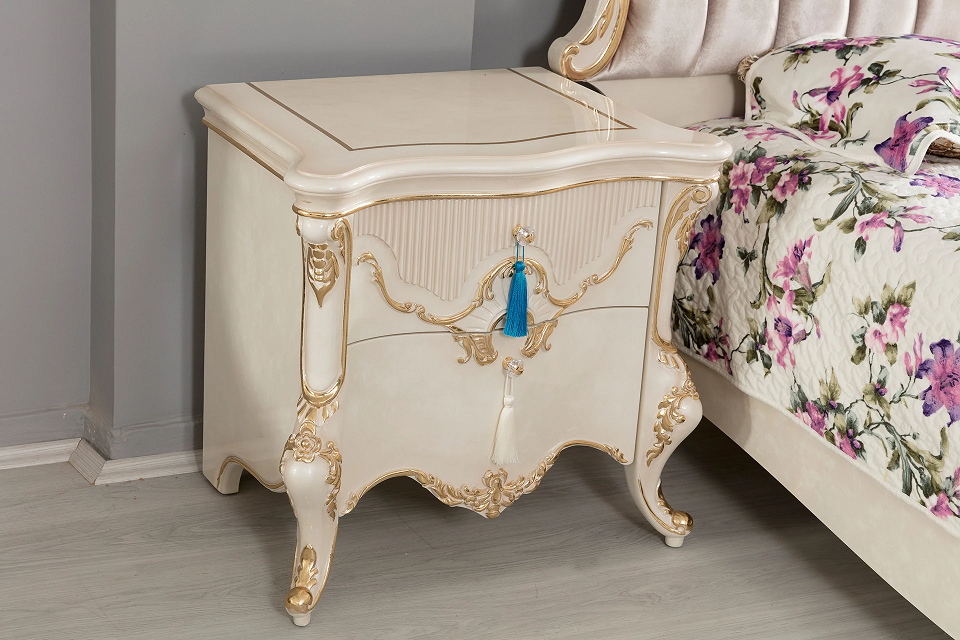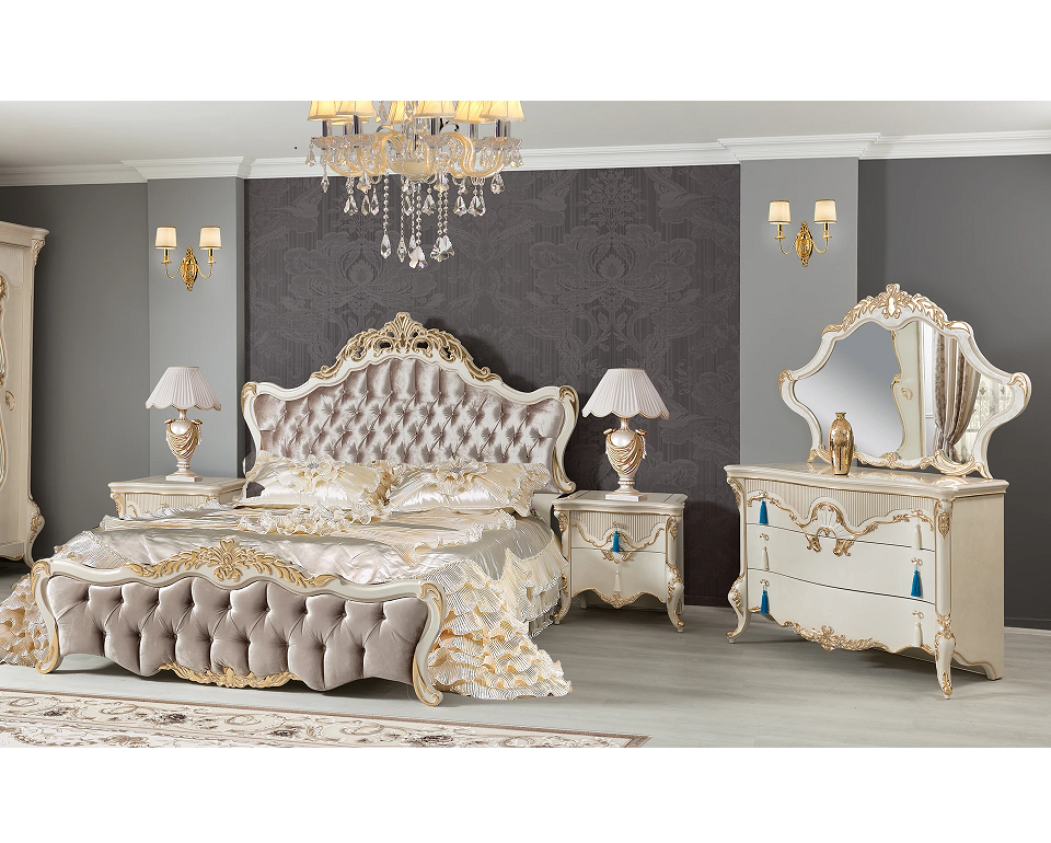 Juego de Dormitorio de Lujo con Tela de Seda Italiana Antigua, Madera Maciza Tallada Estilo Francés, Cama Clásica Blanca y Dorada Tamaño King o Queen para el Hogar