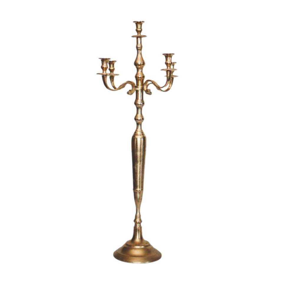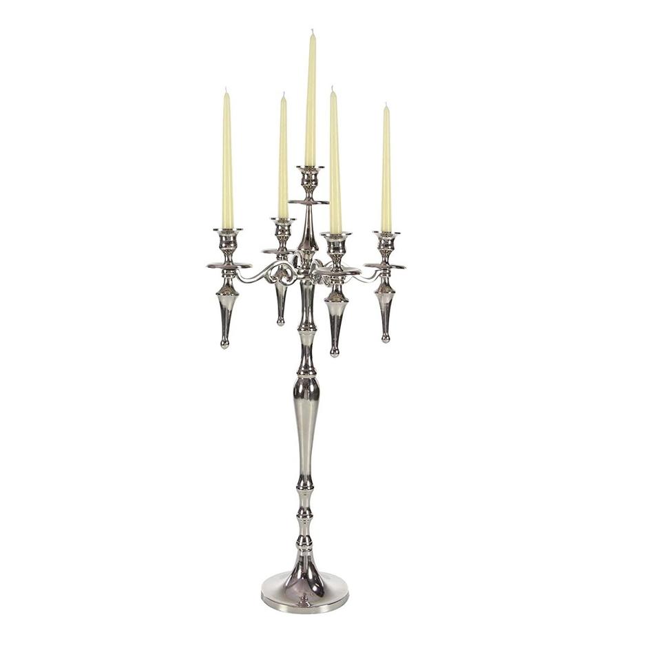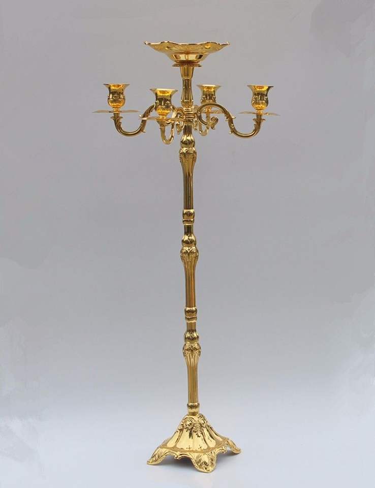 Candelabro de metal de varios brazos para decoración de mesas de recepción de bodas y elegante arreglo de centro de mesa con velas.