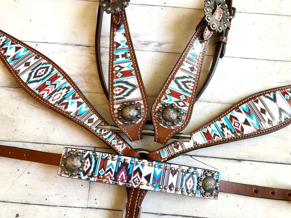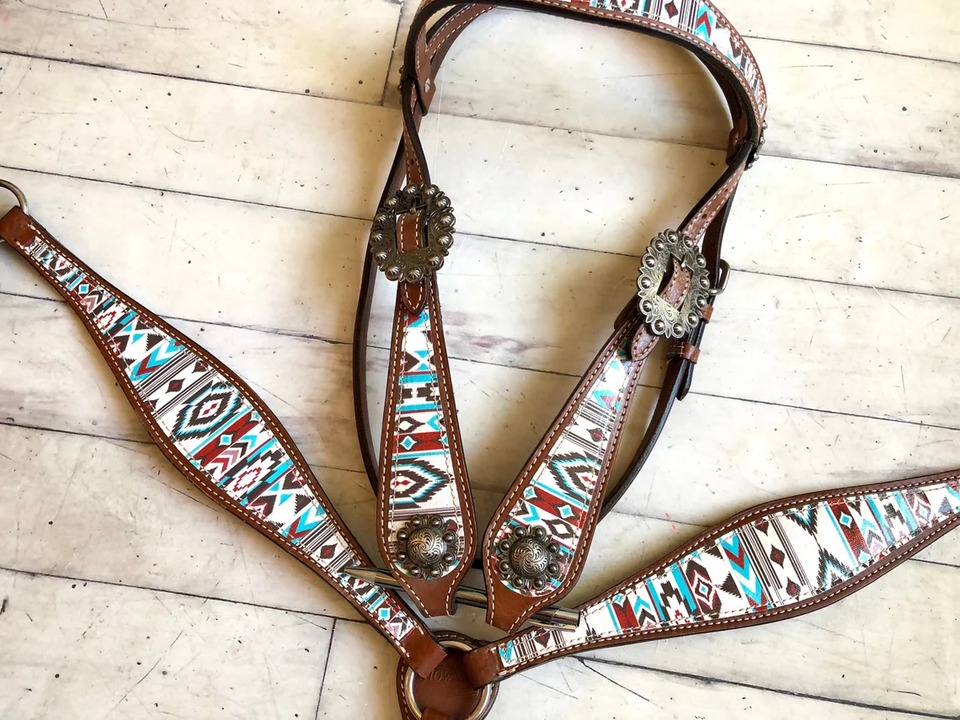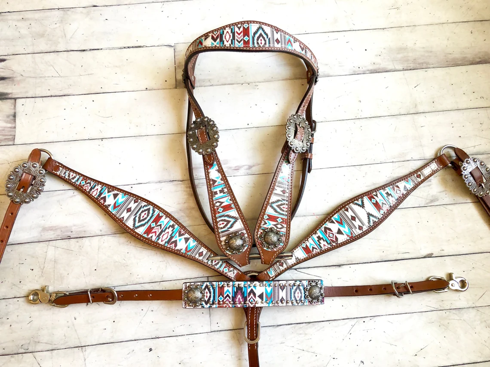 EquiElite Exports - Juego de arreos western de cuero con patrón de diamantes navajo multicolor, cabezada, pechera y brida para caballo, personalizado