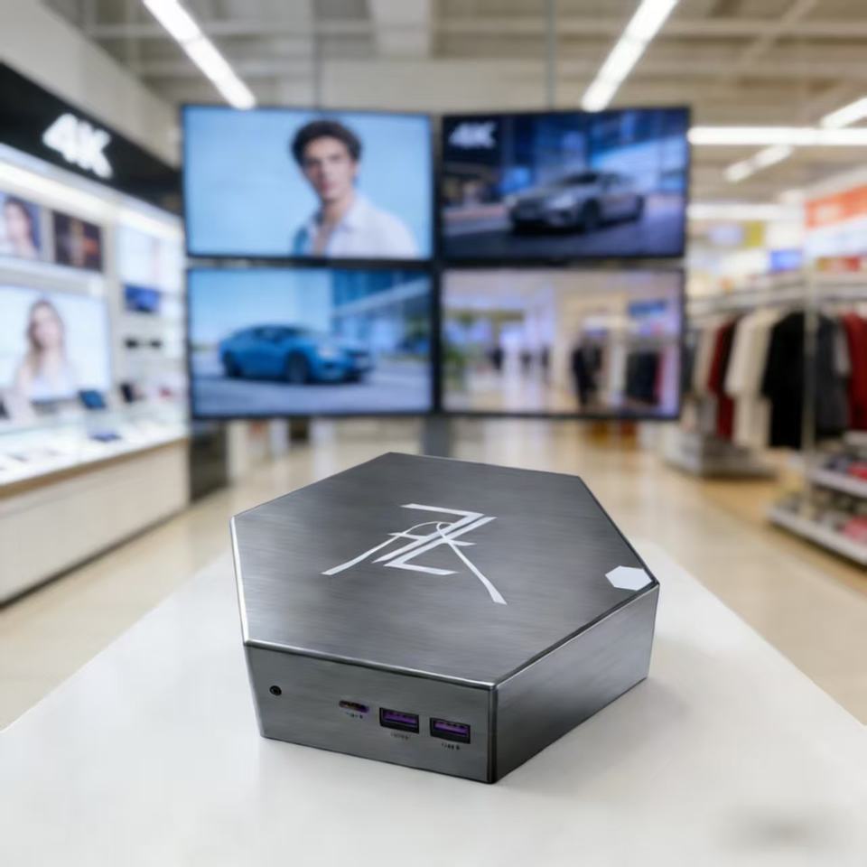 Mini PC Host para Señalización Digital Multi-Pantalla, Admite 4 Salidas 4K, Diseño Compacto para Comercio Minorista y Hostelería