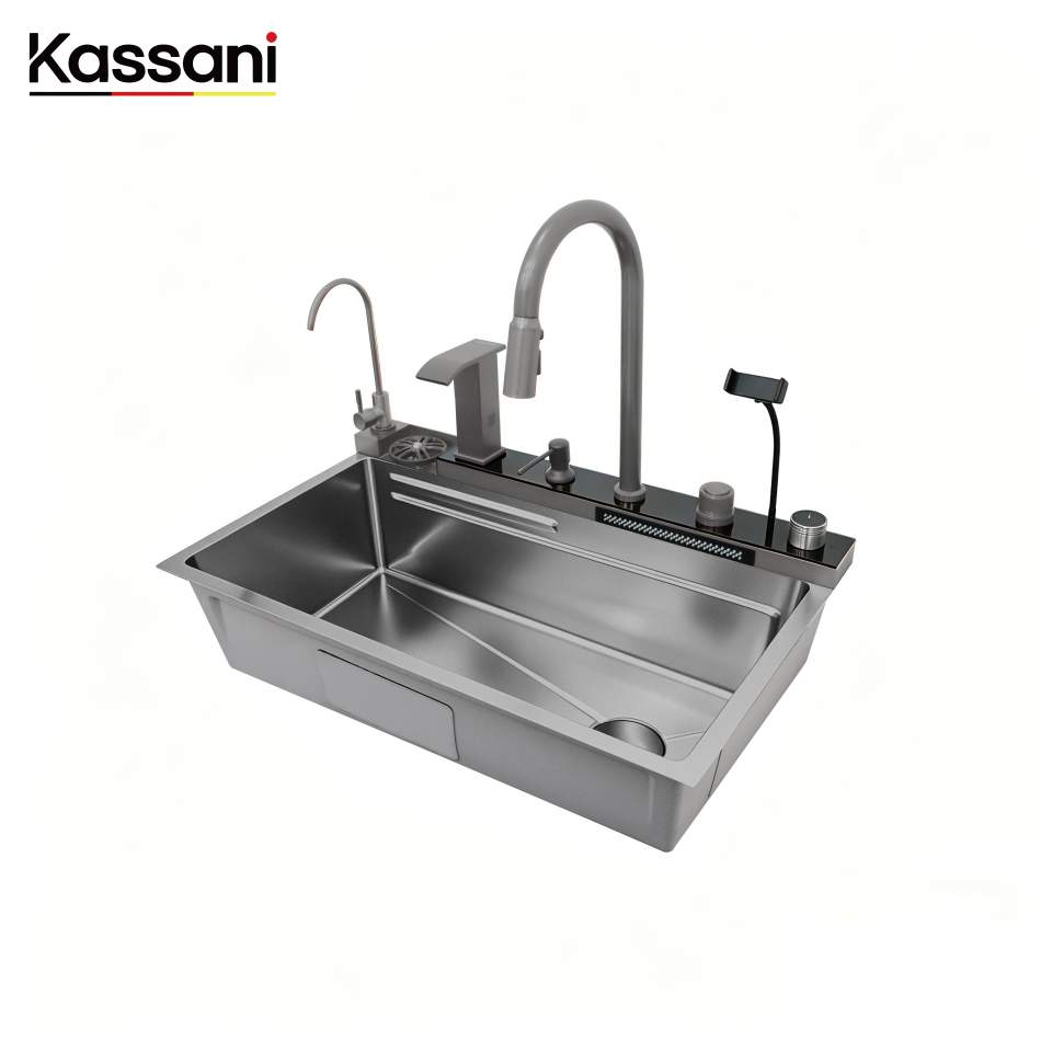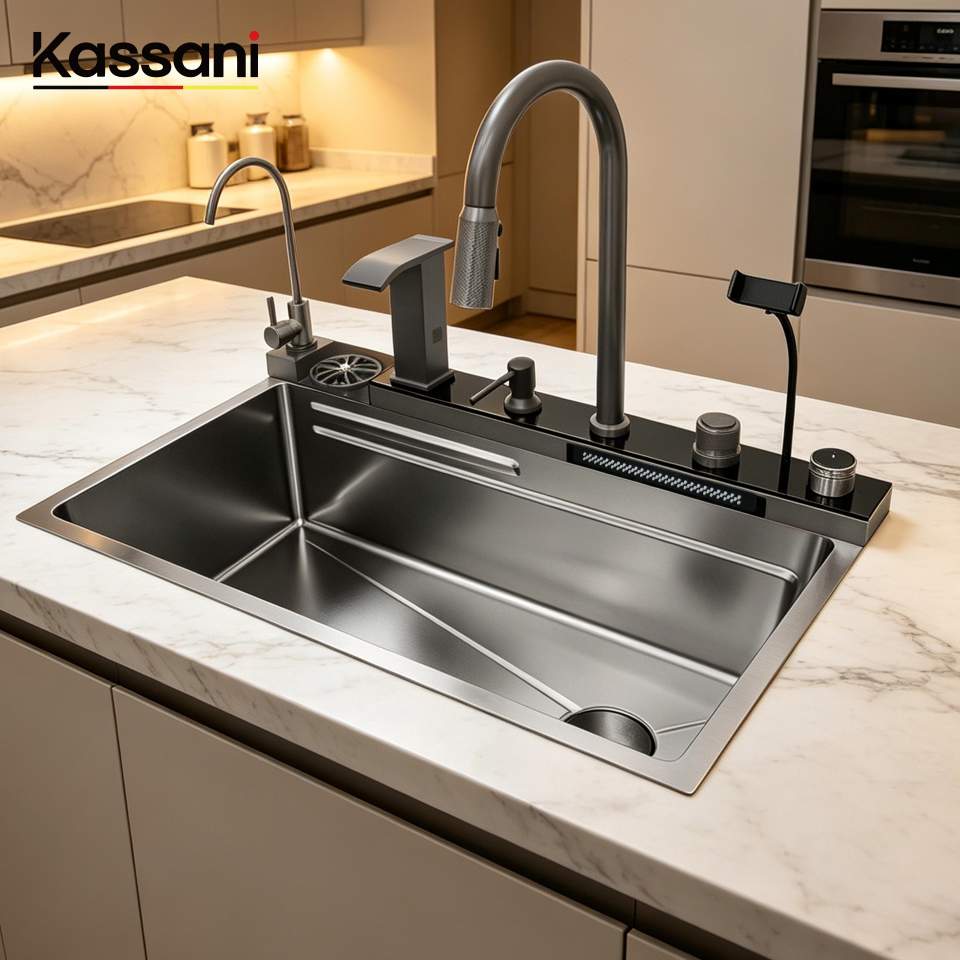 Grifo de Cocina Multifuncional Digital Inteligente con Secador de Manos Extraíble, Fregadero de Cocina de Acero Inoxidable con Cascada