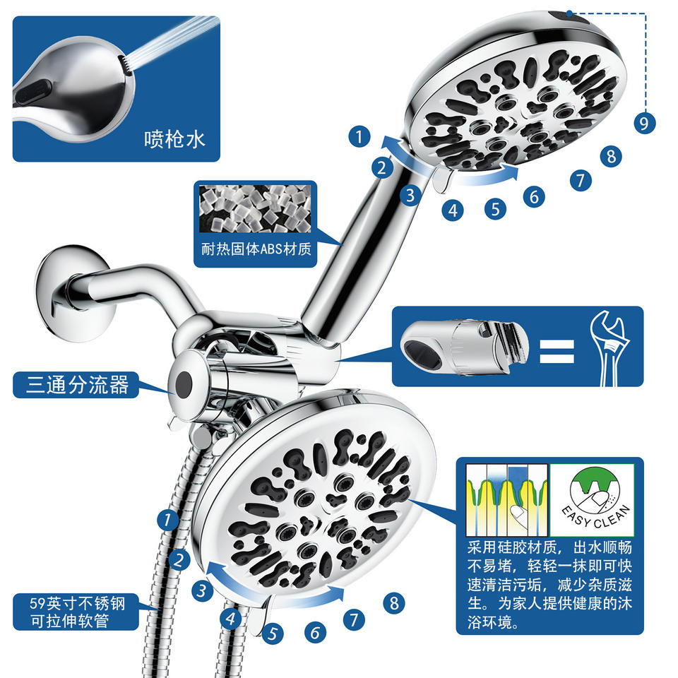 Juego de cabezal de ducha multifuncional de 9 modos con rociador superior tipo lluvia, diseño moderno para uso en el baño