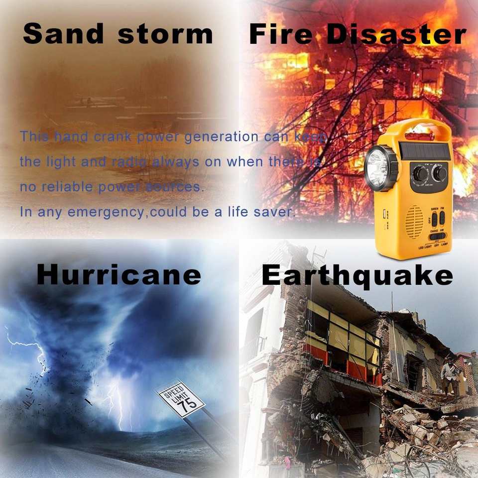 Carga por panel solar, dinamo de manivela, radio FM/AM