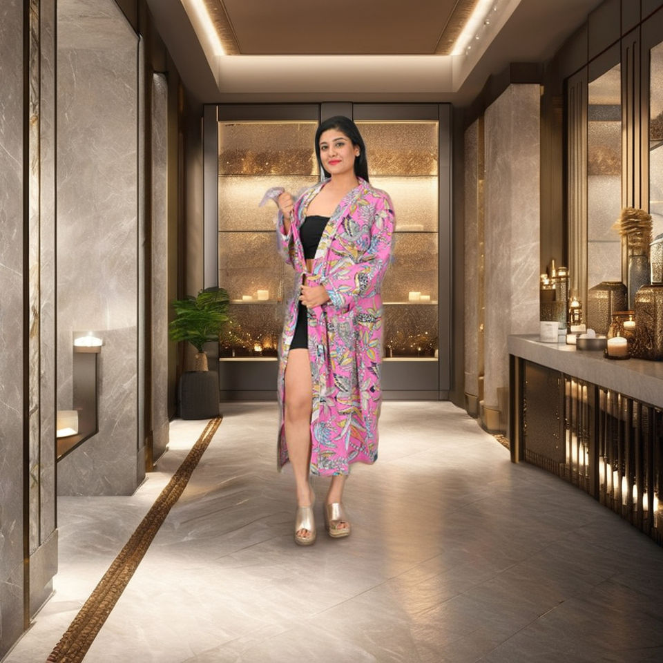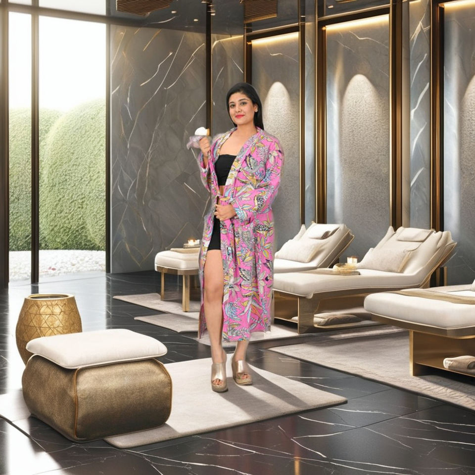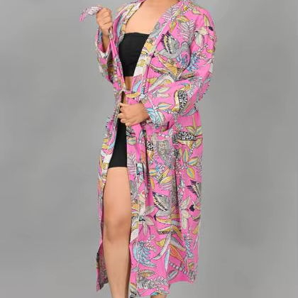 Bata Kimono Multiusos para Mujer, Cuello en V, Cierre con Cordón, Estampado a Mano, 100% Algodón, Ligera, Transpirable, Estilo Boho Elegante