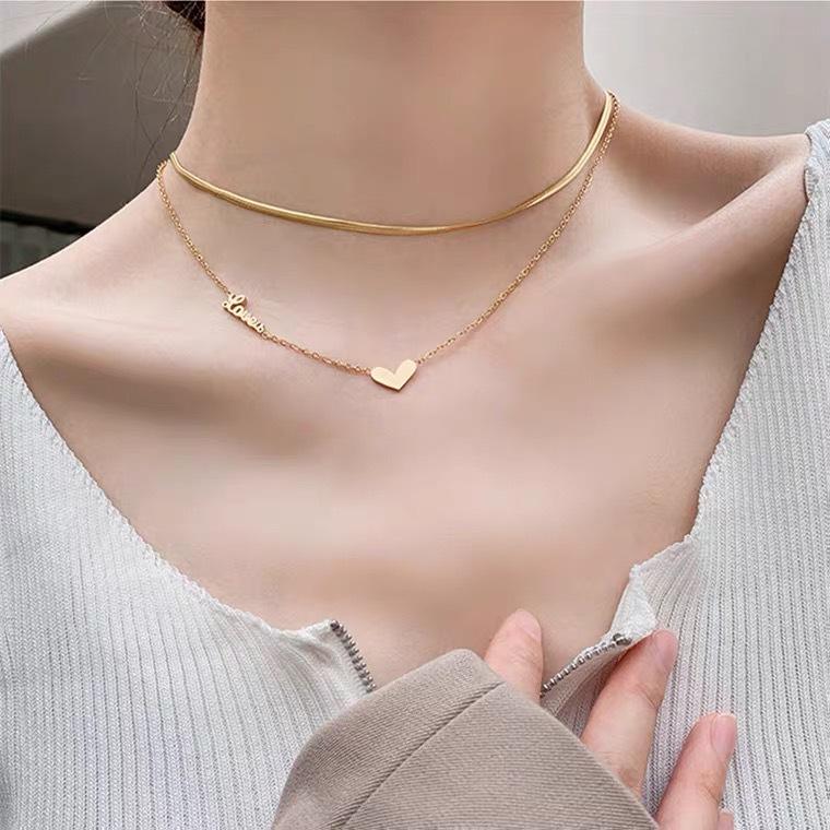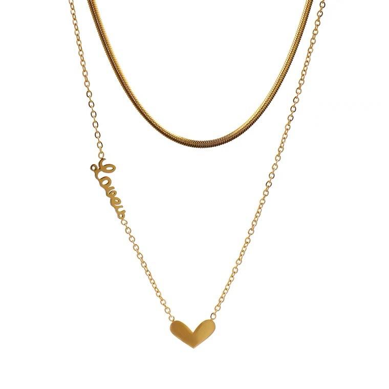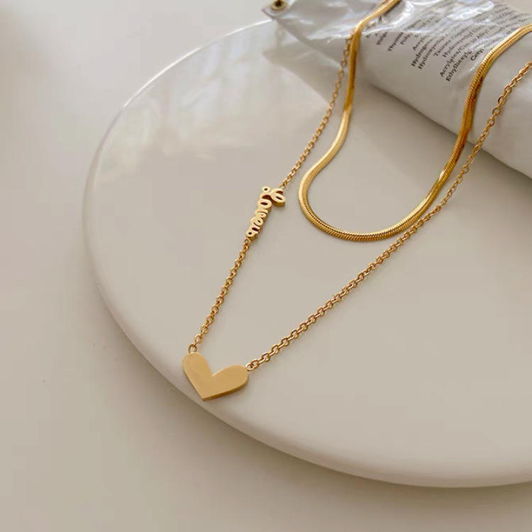 Collar de cadena plana de acero inoxidable chapado en oro de 18k de varias capas con colgante de doble capa con letras, palabras y corazón.