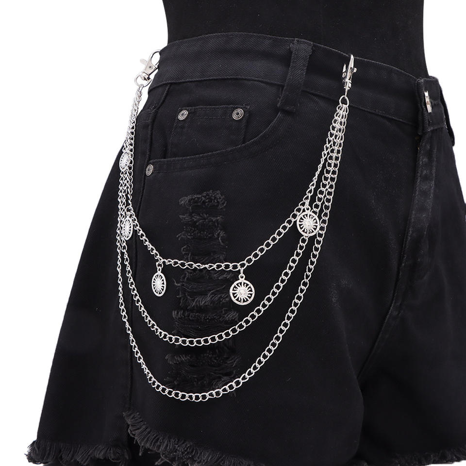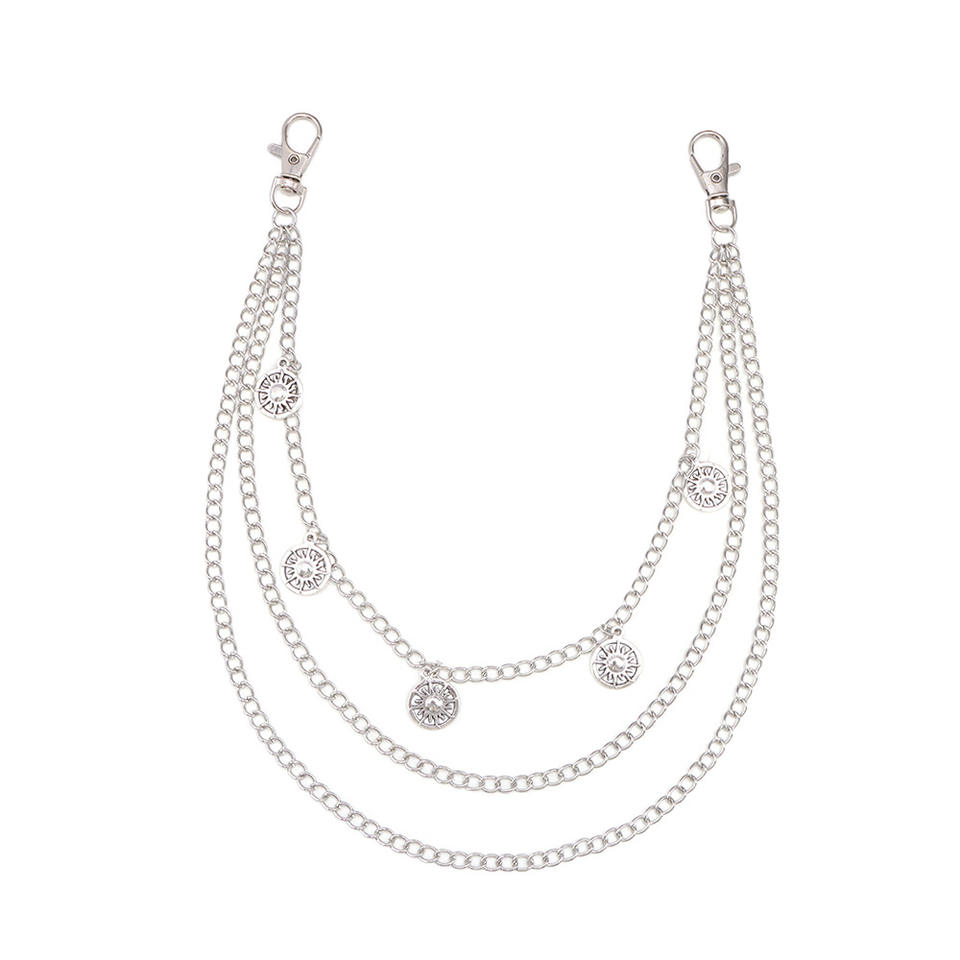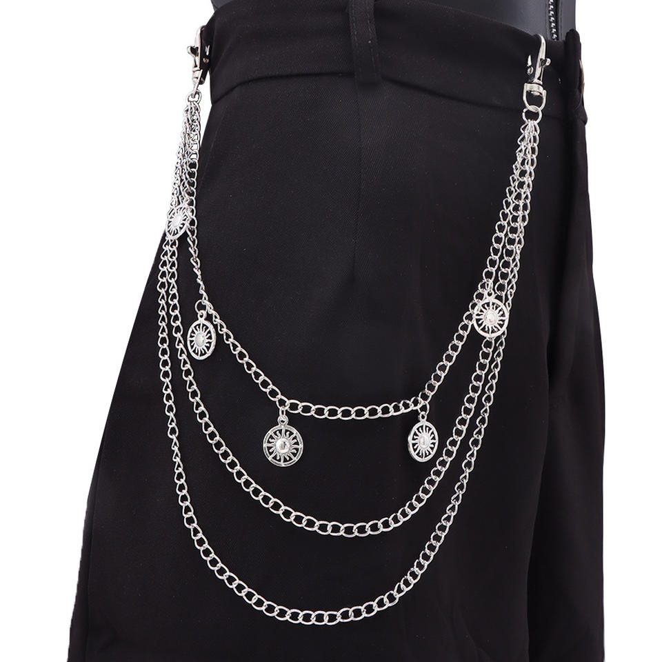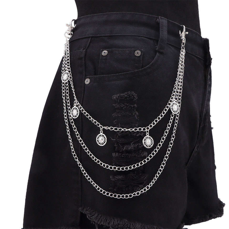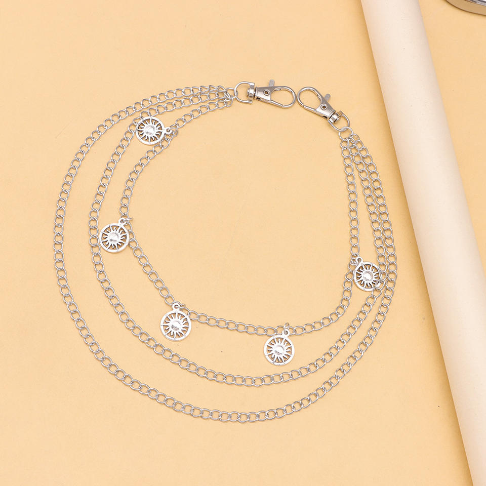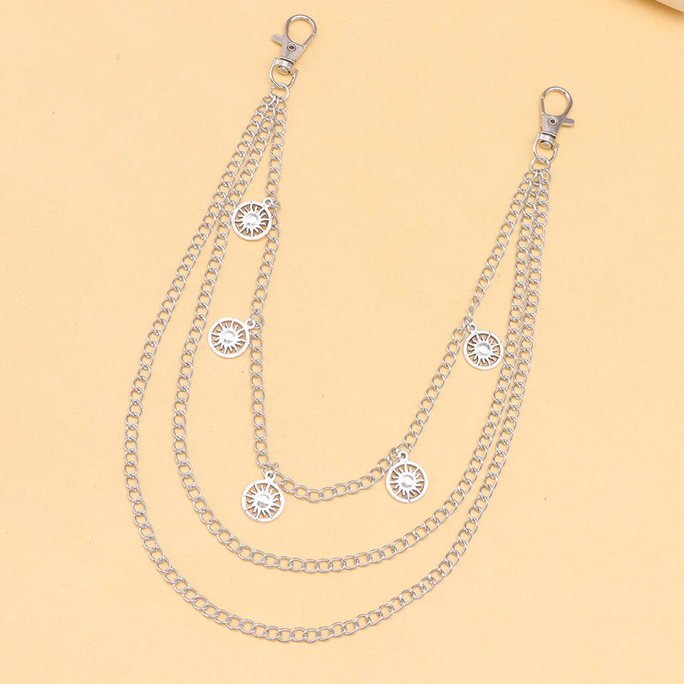 Cadena de pantalón metálica multicapa con colgante de sol, cadena de cintura estilo hip hop para uso casual, color plata tibetana