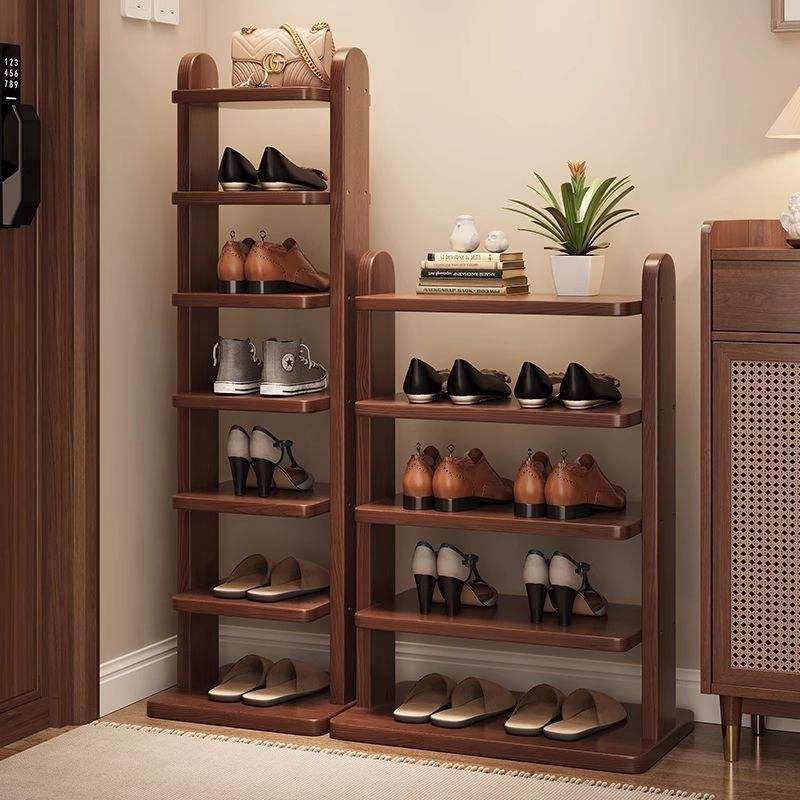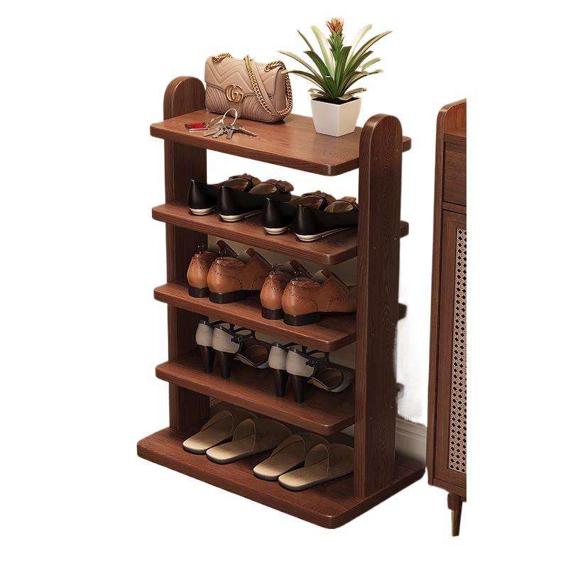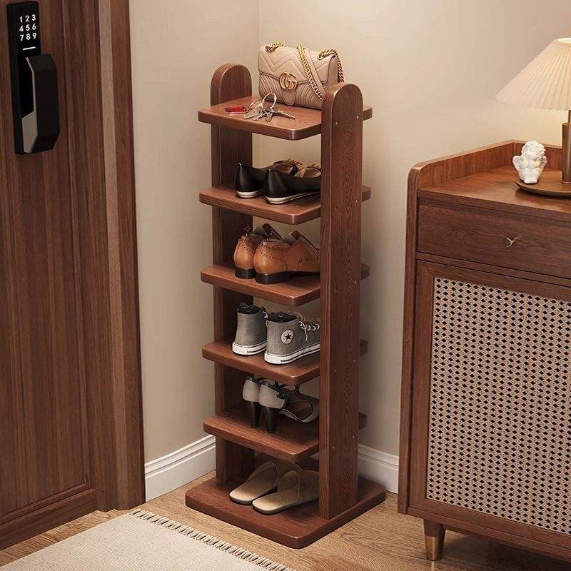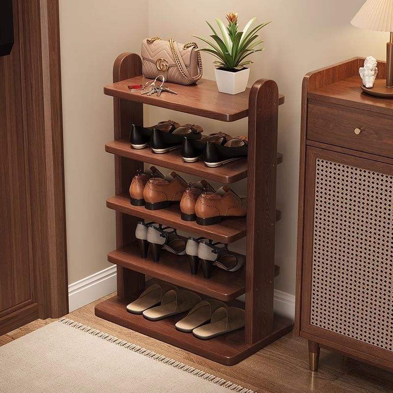 Zapatero de varias capas color nogal, almacenamiento que ahorra espacio para zapatillas, botas y tacones altos en la entrada.