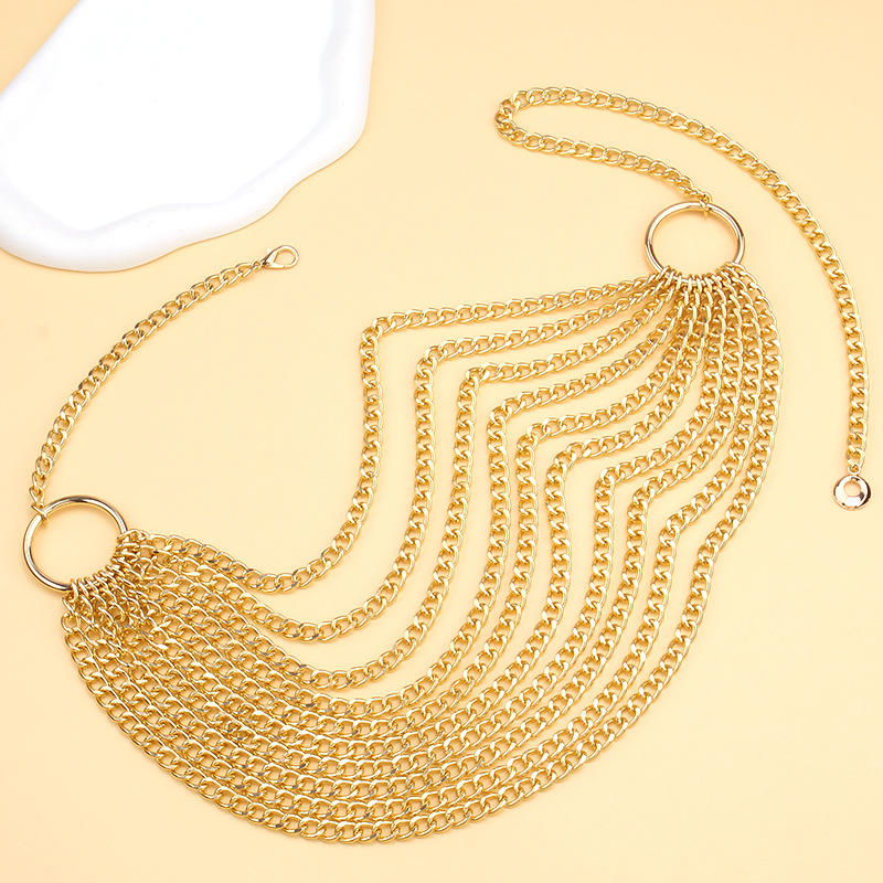 Cadena de cintura de múltiples capas con borlas decorativas de metal dorado para vestidos, camisas y trajes de mujer.
