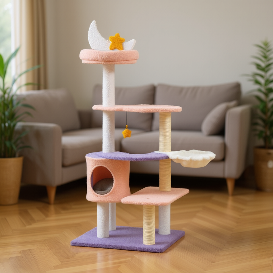 Árbol rascador multinivel para gatos con postes de sisal, 5 niveles, casa para gatos de color morado y rosa para gatos de interior