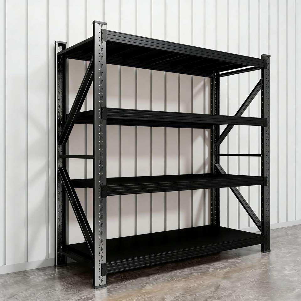 Estantería de Almacenamiento Multinivel de 4 Niveles, Acero Laminado en Frío Negro, Unidad de Estanterías Ajustable con Recubrimiento Electrostático en Polvo para Almacén