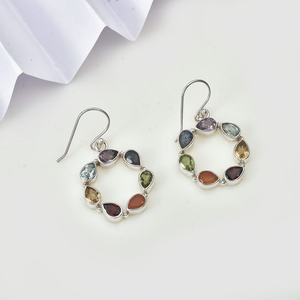 Pendientes de piedras preciosas multicolor en plata de ley 925 con engaste clásico en bisel plateado, pendientes modernos para mujer.