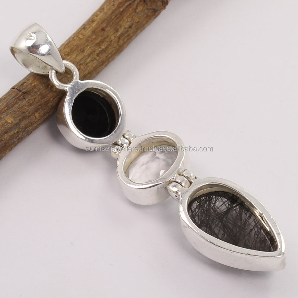 Bisel lindo de múltiples formas 925 Colgante solitario de plata esterlina sólida Cuarzo turmalado natural y otras piedras preciosas