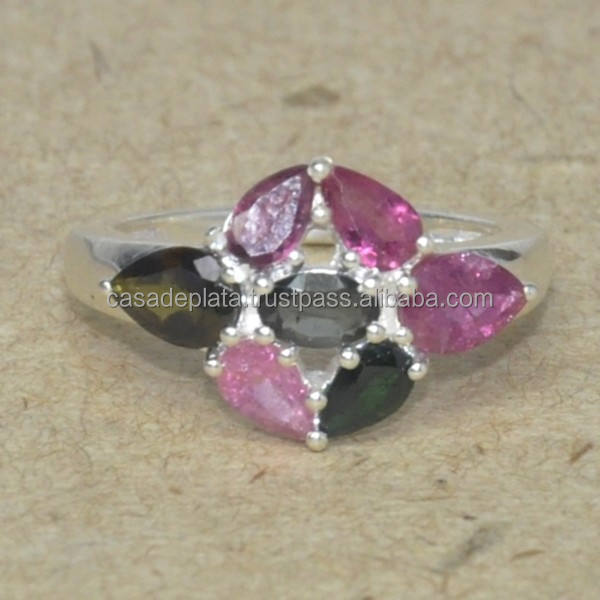 Anillo de piedras preciosas de turmalina múltiple Anillo de Plata de Ley 925 Anillo de moda Chapado en plata clásica para aniversario de boda o fiesta.