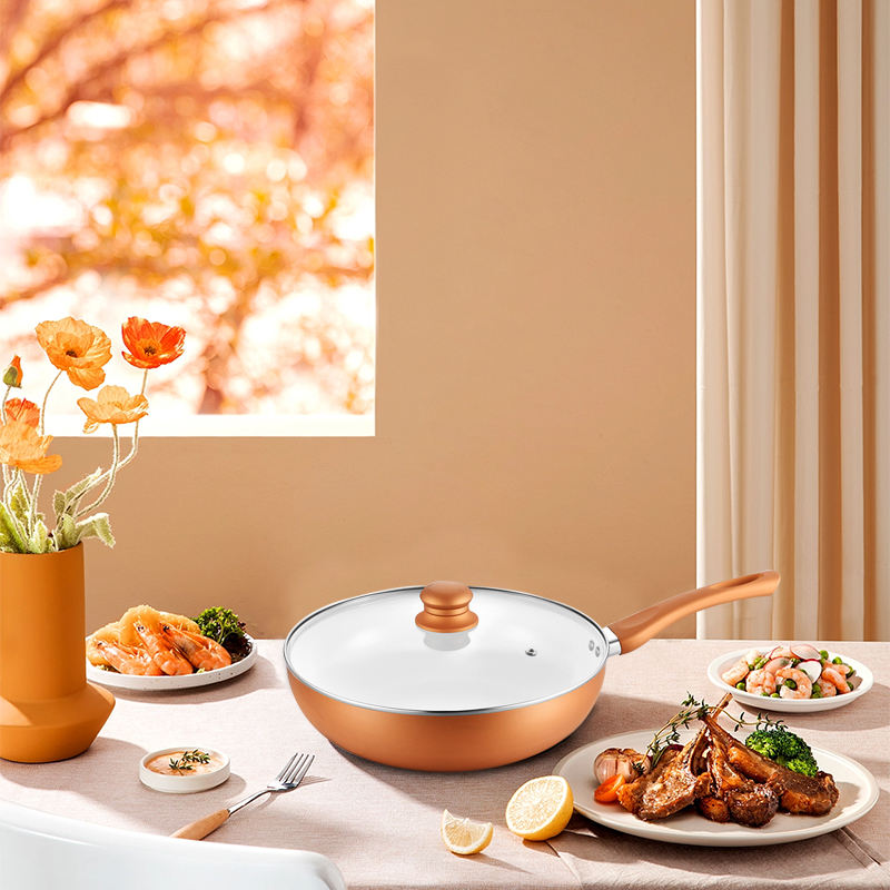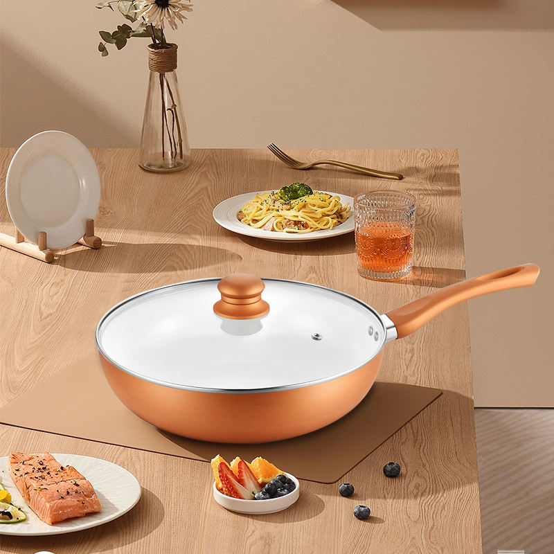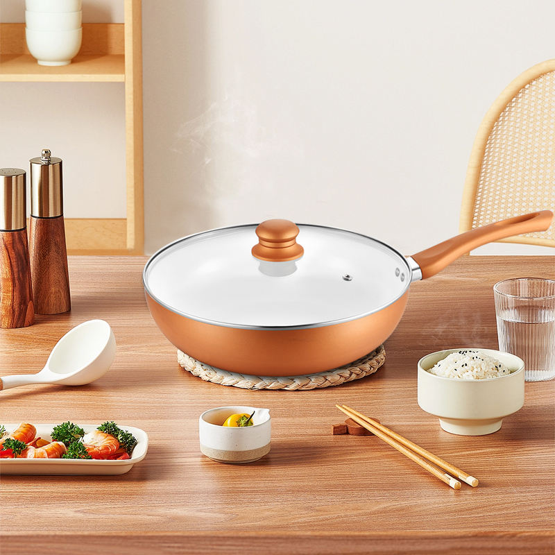 Multifunción 28cm La mejor cocina Antiadherente Cocina Mango de madera Corea Aluminio Cerámica Wok Pan con tapa de vidrio