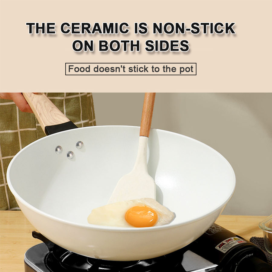 Multifunción 32cm mejor cocina antiadherente cocina arte mango de madera Corea Die Cast cerámica Wok Pan con tapa de vidrio