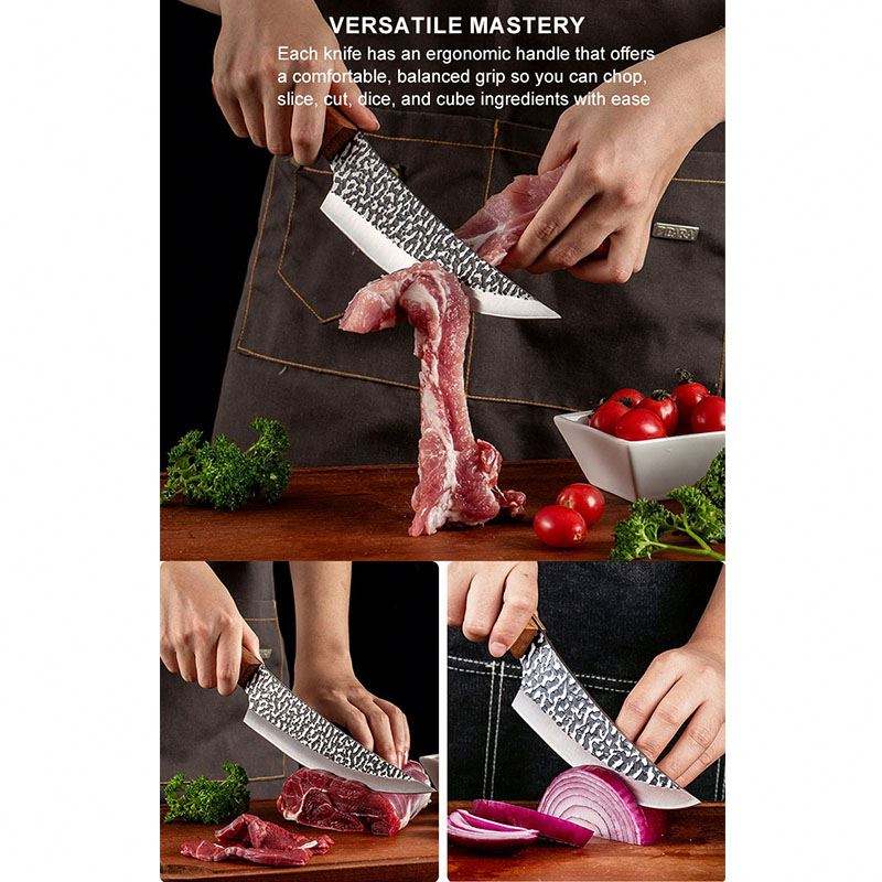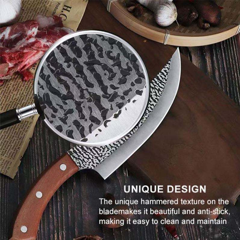 Cuchillo de Cocina Multifuncional Forjado a Mano, Cuchillo de Carnicero Curvo de Alta Resistencia con Hoja de Martillo y Mango de Madera Pakka