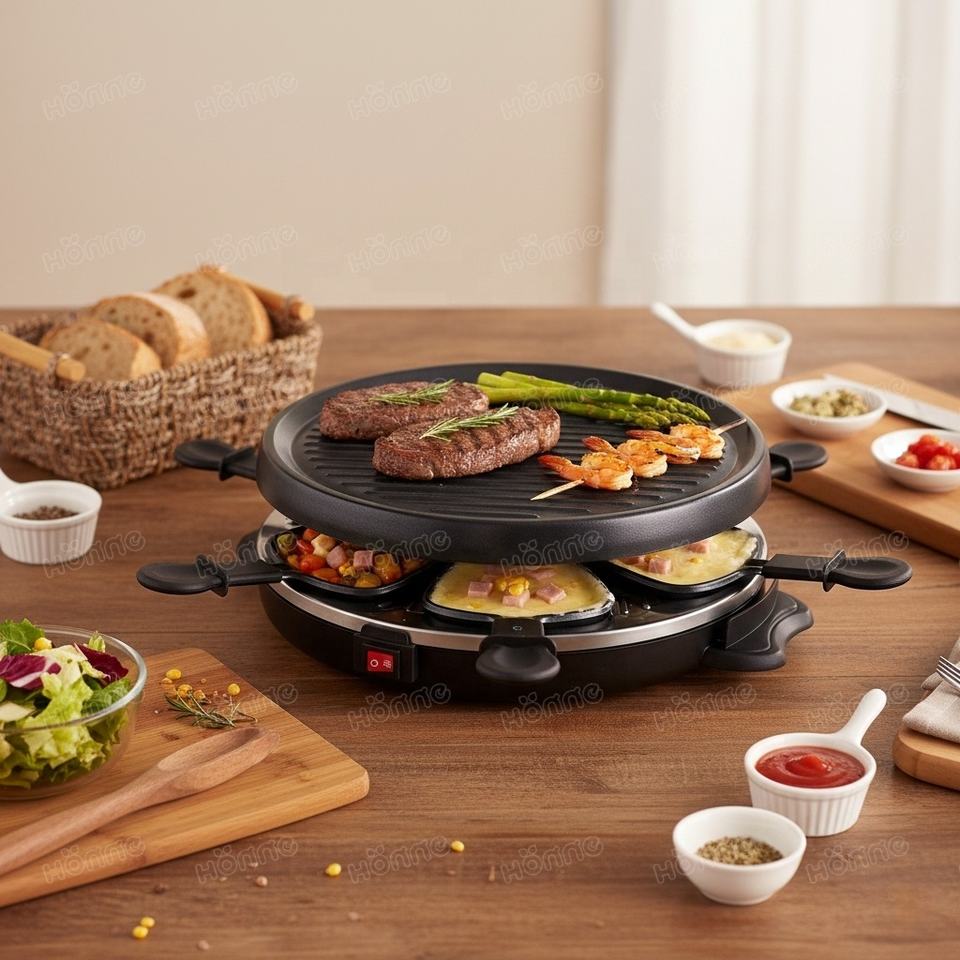 Parrilla Eléctrica Multifuncional para Raclette para 6 Personas, Parrilla Redonda Antiadherente para Fiestas en Interiores con Mini Moldes para Queso