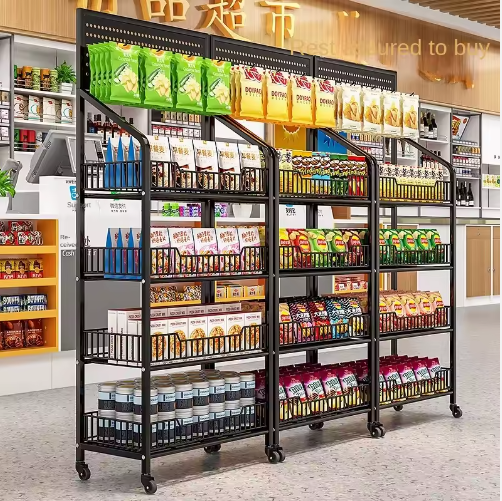 Expositor/estantería de almacenamiento multinivel, giratorio y móvil para aperitivos en centros comerciales – Conveniente.