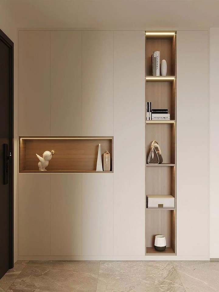 Almacenamiento de armario de madera abierto gris para dormitorio