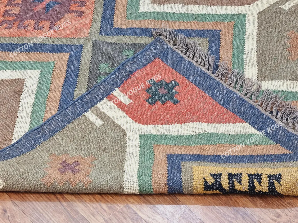 Alfombra de corredor Kilim de yute de lana tejida a mano multicolor, pila alta con motivo azteca abstracto, técnica de mechones, estilo nativo Kilim