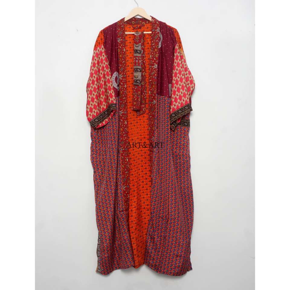 Kimono de Seda Multicolor, Tela de Sari Cosida a Mano, Ropa de Salón para Festivales, Vestido de Sari Indio Reciclado, Hermoso Kimono