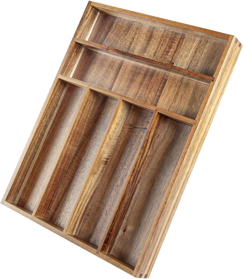 Bandeja de cubiertos de madera de Acacia multifunción de 6 compartimentos, cajón de cocina rectangular, organizador para cubiertos, almacenamiento de utensilios para el hogar