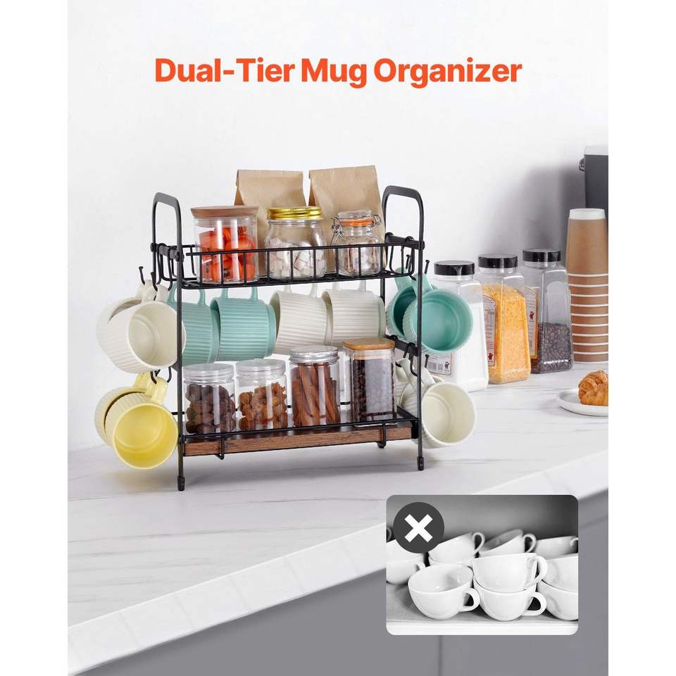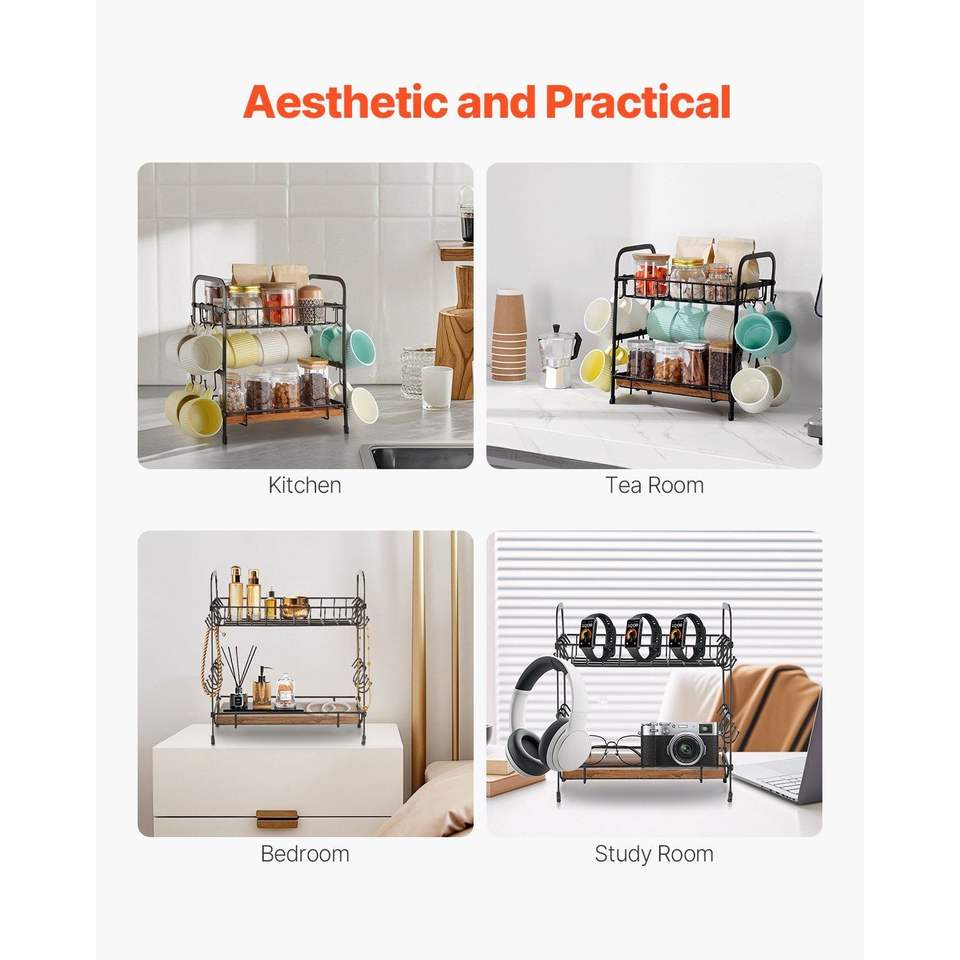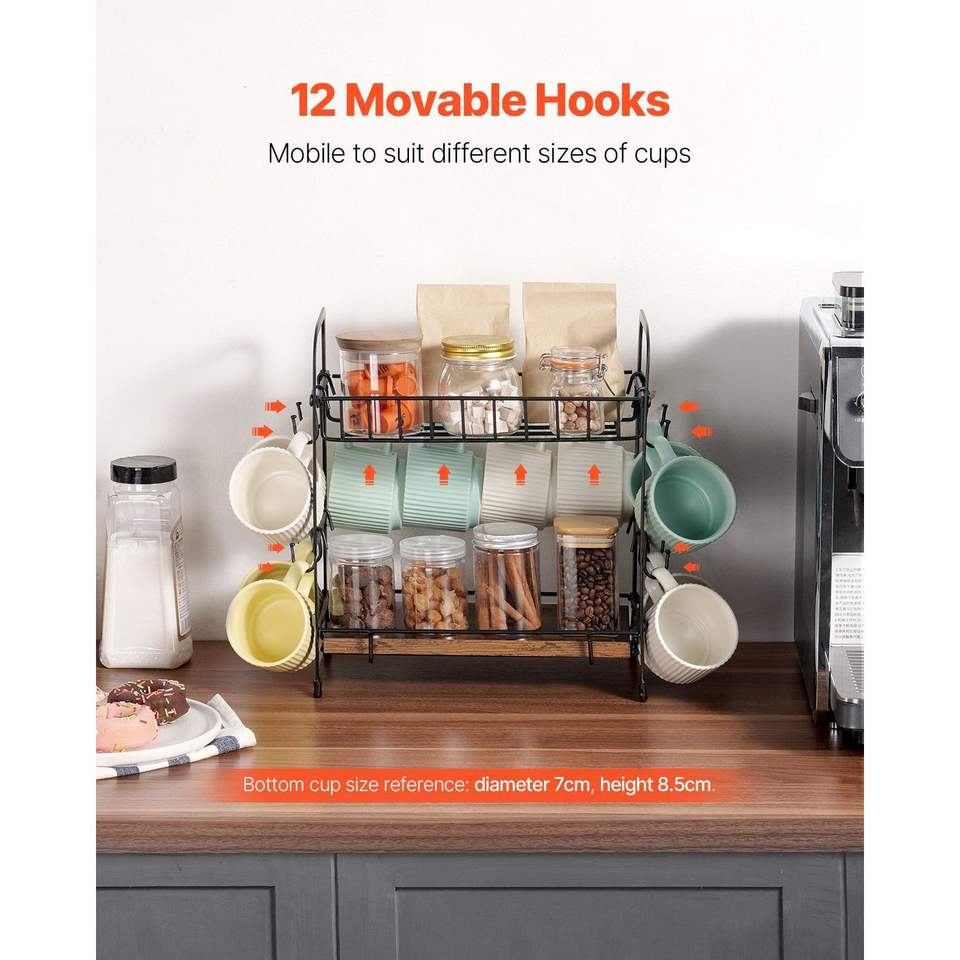 Organizador de Barra de Café Multifuncional de 2 Niveles, 12 Ganchos Móviles, 2 Estantes, Estantes de Exhibición para Mostrador