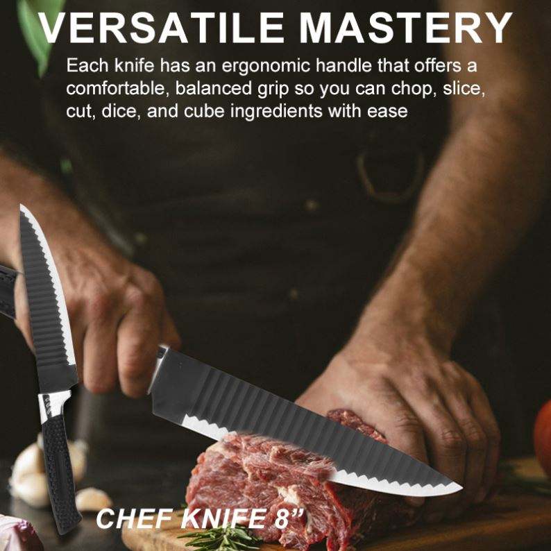 Juego de Cuchillos de Cocina Multifuncionales Negros con Revestimiento Antiadherente, Cuchillas Afiladas de Acero Inoxidable, Tijeras, Cuchillo para Asar Carne, 8 Piezas