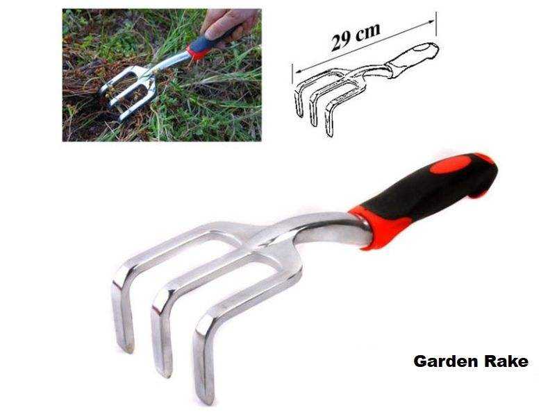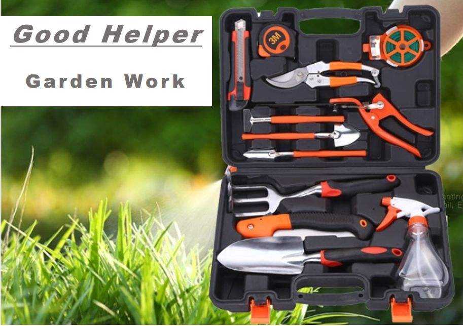 Tie wire, watering can, Pruning shears, Mowing shears, Small shovel, Smal rake, Small pointed shovel, Garden rake, Garden shovel, Folding saw, Tweezers, Measuring Tape, Utility Knife, Blow molding box