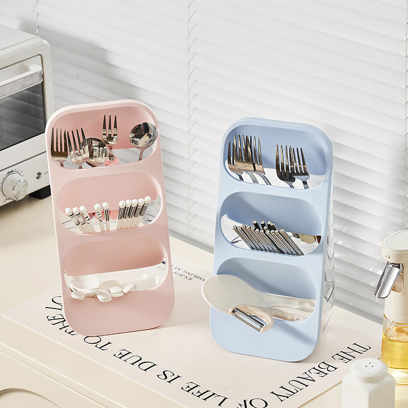 Soporte multifuncional para palillos a prueba de polvo, estante de almacenamiento de utensilios de cocina de tres capas con drenaje para organizar cucharas, tenedores y cuchillos