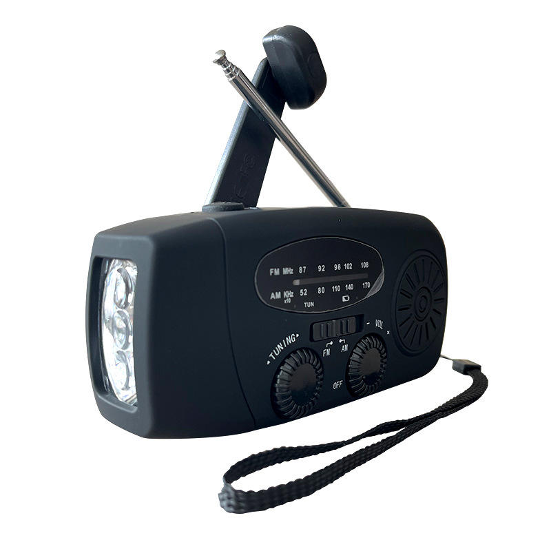 Radio multifuncional con energía solar para exteriores, luces 3LED con manivela manual, banda meteorológica FM, fuente de alimentación de CA, función de linterna de plástico