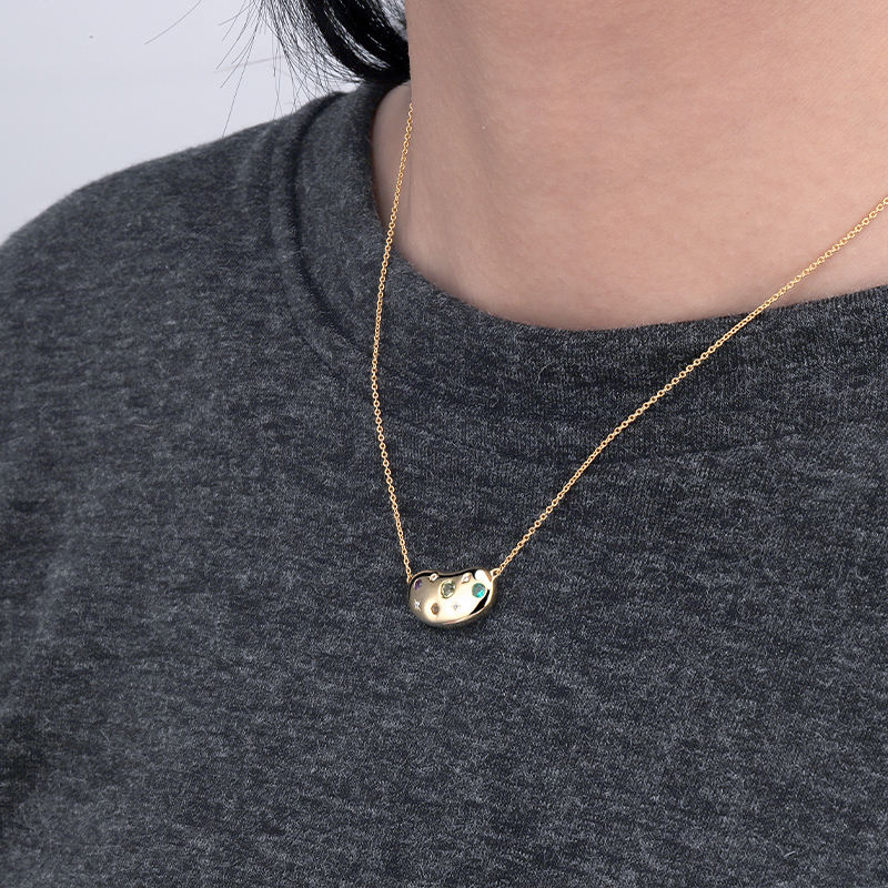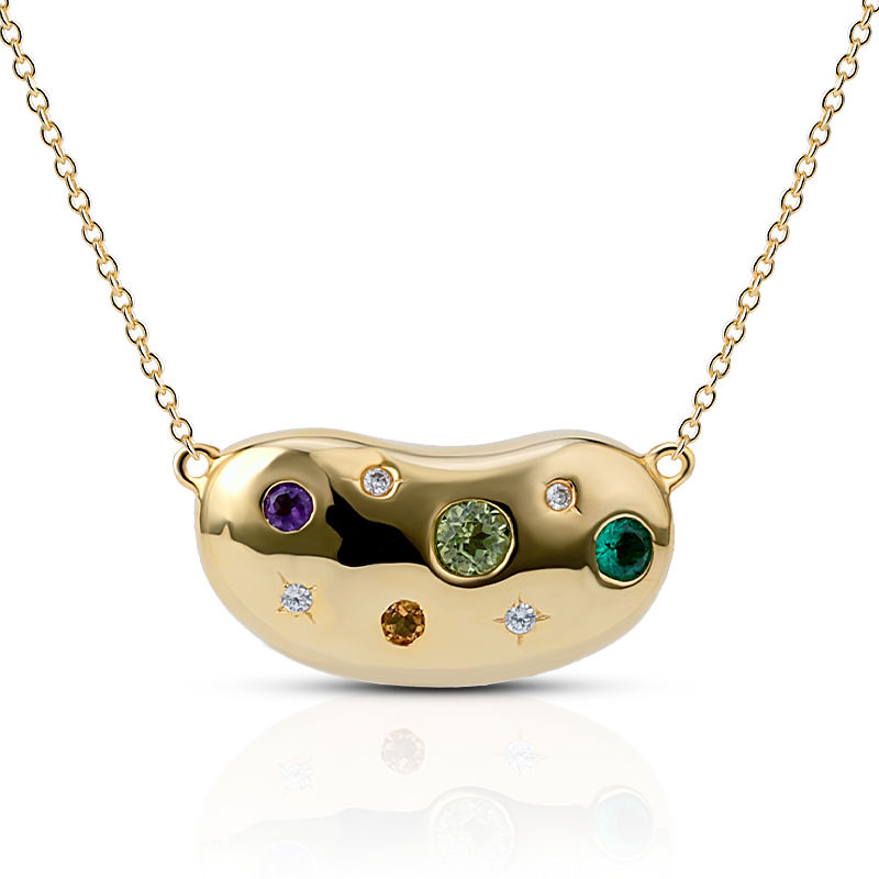 Collar con Colgante Fino en Forma de Frijol con Incrustaciones de Piedras Preciosas de Circonita Blanca, Amatista, Topacio Amarillo y Peridoto en Varios Colores
