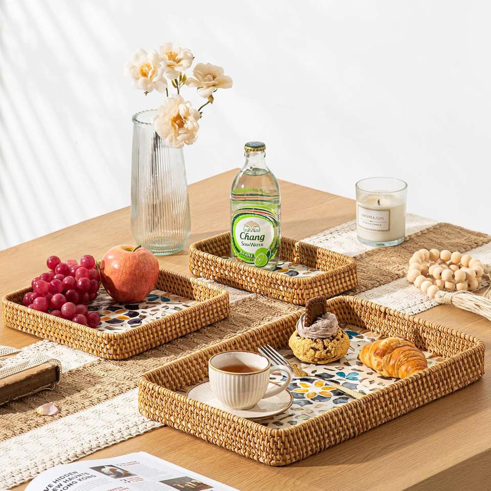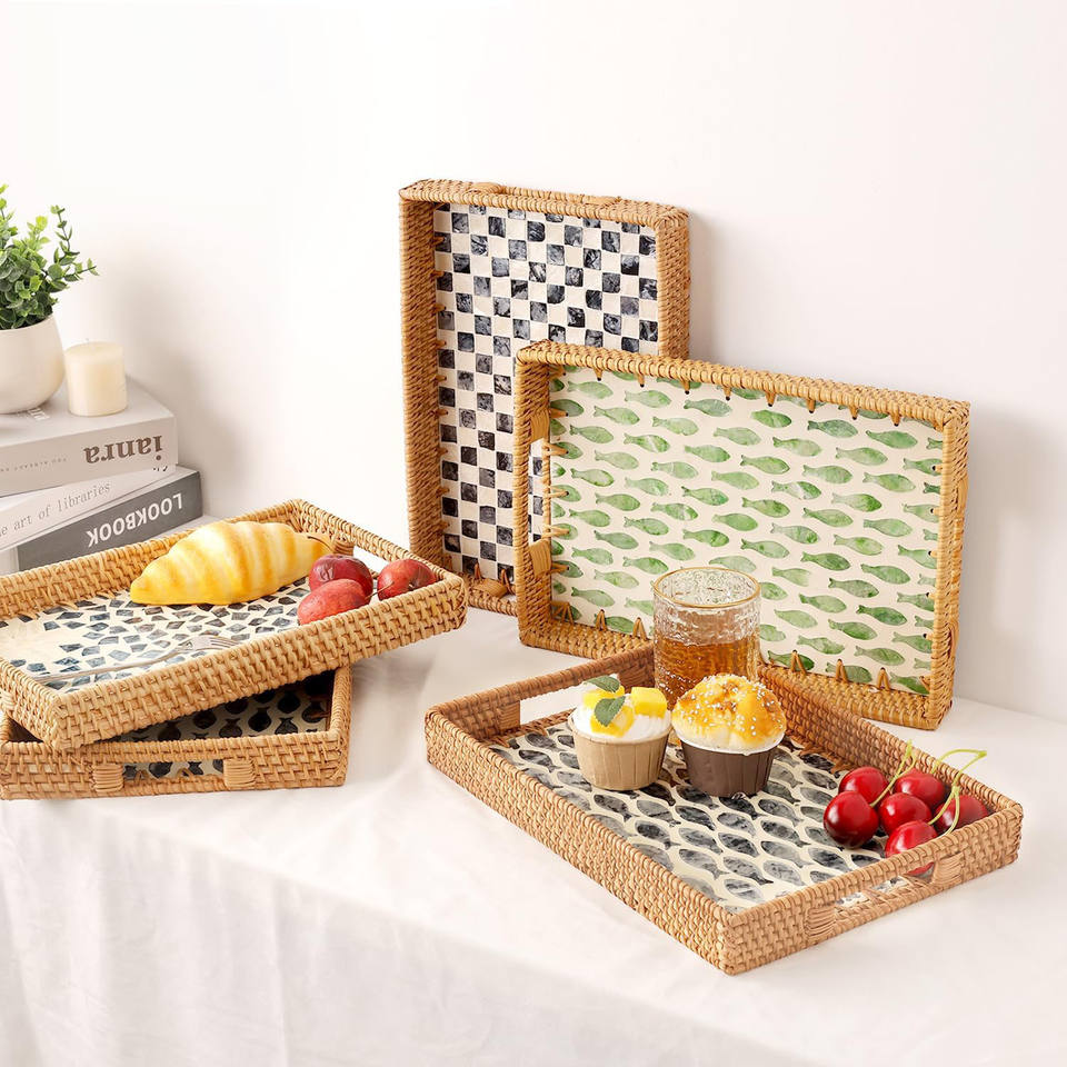 Bandejas de ratán de varios tamaños con nácar, regalo de evento de inauguración de la casa, bandeja de conchas de fregona de mosaico