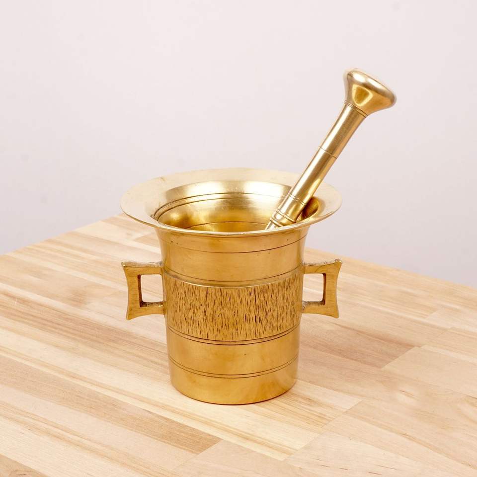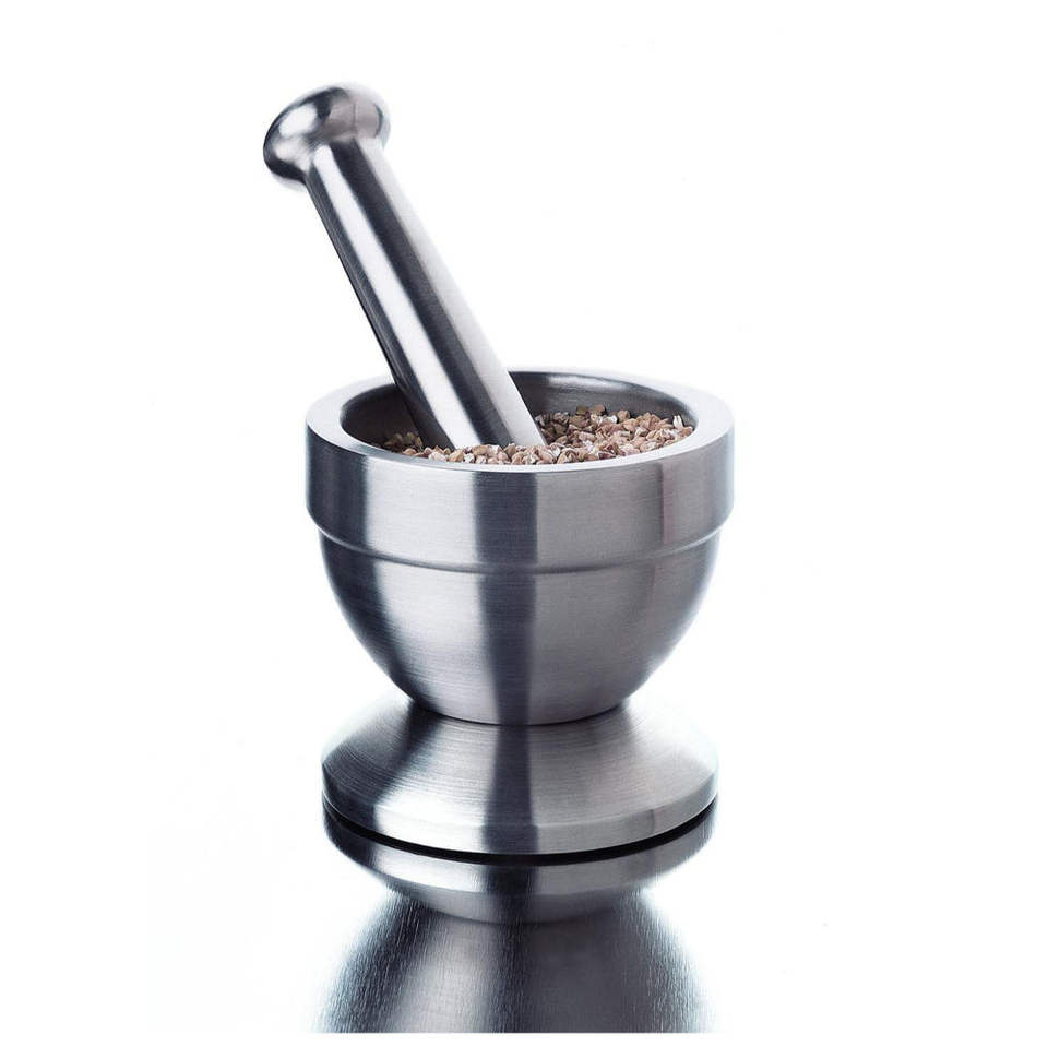 Juego de mortero y pilón de metal multiusos para moler especias, hierbas, medicamentos, uso en cocina y ayurveda.