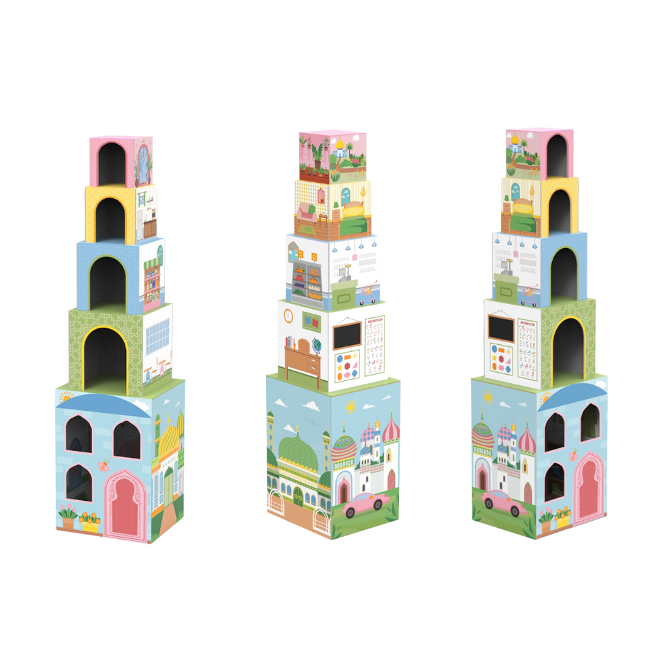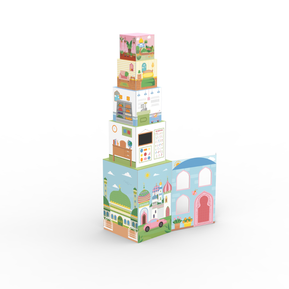 Juguete de juego de roles para niños musulmanes, mezquita de madera y casas apilables para el hogar